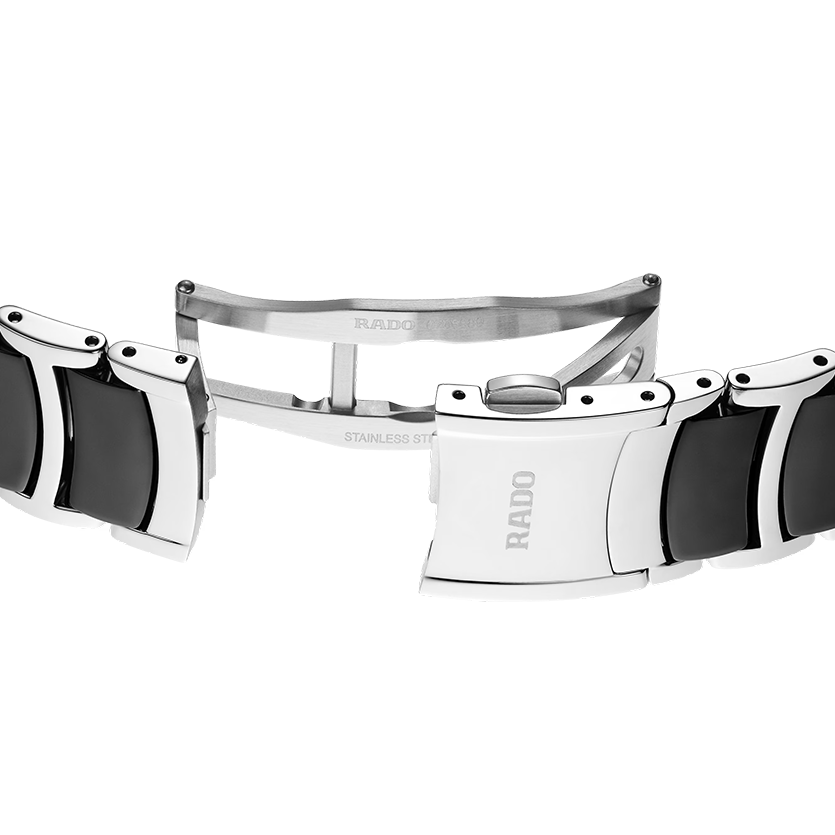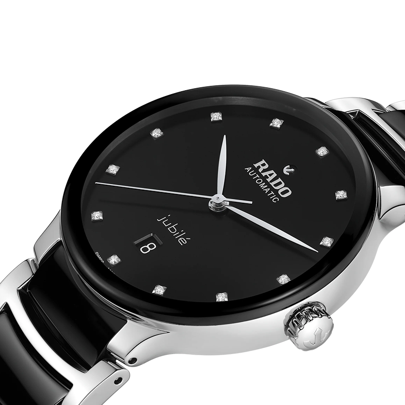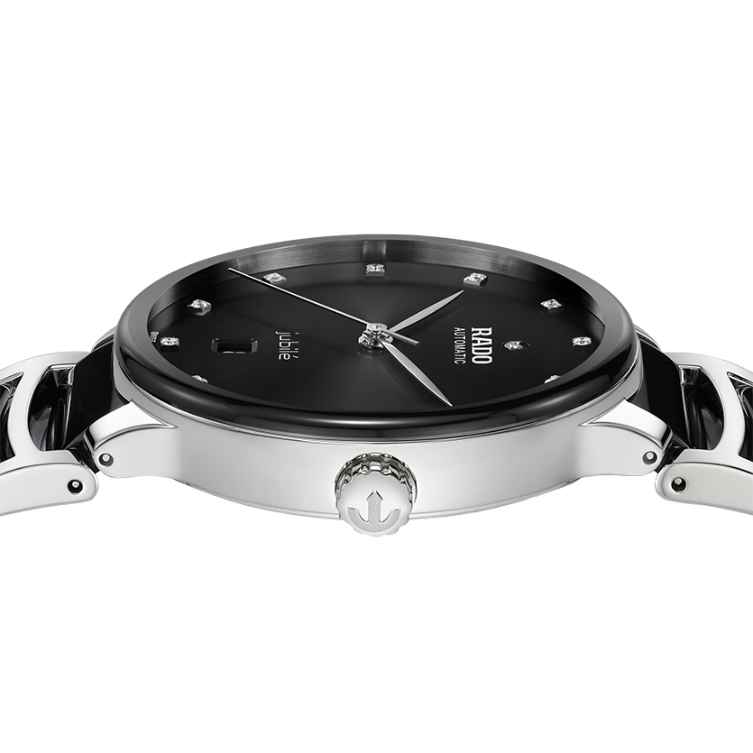 Ref. R30018742 - Die klassische Centrix Automatic Diamonds wurde nicht nur technisch, sondern auch ästhetisch überarbeitet. Beim neuen Modell reicht das abgerundete Saphirglas bis hin zum Rand. Außerdem geht das gewölbte Gehäuse nahtlos in den geschwungenen Kristallrand über. Die überarbeiteten Bandanstöße am Gehäuse und das Armband aus poliertem Edelstahl mit Mittelgliedern aus schwarzer Hightech-Keramik runden das Gesamtbild dieses ikonischen Zeitmessers perfekt ab. Das schwarze Zifferblatt mit Sonnenschliff und 12 Diamanten wird durch das per Druck aufgetragene Jubilé-Logo noch besser zur Geltung gebracht und ist perfekt auf die rhodiumfarbenen Zeiger abgestimmt. Im Inneren übertrifft das mit drei Zeigern ausgestattete, in 5 statt 3 Lagen getestete Uhrwerk vom Kaliber R763 dank einer nicht-magnetischen Nivachron™ Spiralfeder die Standardtestanforderungen und sorgt für eine höhere Zuverlässigkeit und Genauigkeit. Die Uhr ist bis zu einer Tiefe von 50 m wasserdicht und bietet eine Gangreserve von 80 Stunden.