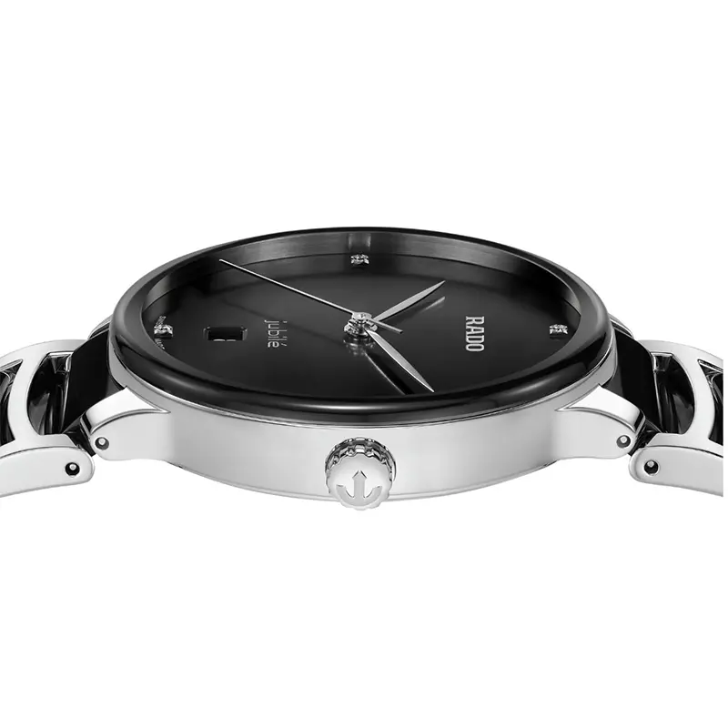Ref. R30021712 - Die klassische Centrix Quartz Diamonds wurde nicht nur technisch, sondern auch ästhetisch überarbeitet. Beim neuen Modell reicht das gewölbte Saphirglas bis hin zum Rand und scheint nahtlos in das sanft gerundete Gehäuse überzugehen. Die perfekt angepassten Bandanstösse verbinden das Gehäuse mit dem Armband aus poliertem Edelstahl und Mittelgliedern aus schwarzer Hightech-Keramik. Sie verleihen dem ikonischen Zeitmesser seine vollkommene Erscheinung. Das schwarz lackierte Zifferblatt mit 4 Diamanten kommt durch das aufgedruckte Jubilé-Logo noch besser zur Geltung und ist perfekt auf die rhodiumfarbenen Zeiger abgestimmt. Dank der PreciDrive- und HeavyDrive-Technologie im R073 Quarzwerk zeichnet sich die Uhr durch eine grössere Genauigkeit und Stossfestigkeit aus. Die Uhr ist bis zu einer Tiefe von 50 m wasserdicht.