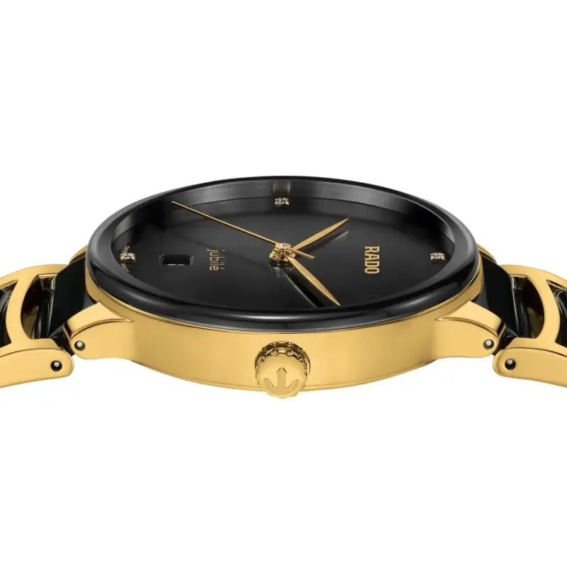 Ref. R30022712 - Die klassische Centrix Quartz Diamonds wurde nicht nur technisch, sondern auch ästhetisch überarbeitet. Beim neuen Modell reicht das gewölbte Saphirglas bis hin zum Rand und scheint nahtlos in das sanft gerundete Gehäuse überzugehen. Die Gesamtoptik dieses ikonischen Zeitmessers wird durch überarbeitete Bandanstösse am Gehäuse und ein Armband aus poliertem gelbgoldfarbenem Edelstahl mit PVD-Beschichtung und Mittelgliedern aus schwarzer Hightech-Keramik abgerundet. Das schwarz lackierte Zifferblatt mit 4 Diamanten kommt durch das aufgedruckte Jubilé-Logo noch besser zur Geltung und ist perfekt auf die gelbgoldfarbenen Zeiger abgestimmt. Dank der PreciDrive- und HeavyDrive-Technologie im R073 Quarzwerk zeichnet sich die Uhr durch eine grössere Genauigkeit und Stossfestigkeit aus. Die Uhr ist bis zu einer Tiefe von 50 m wasserdicht.