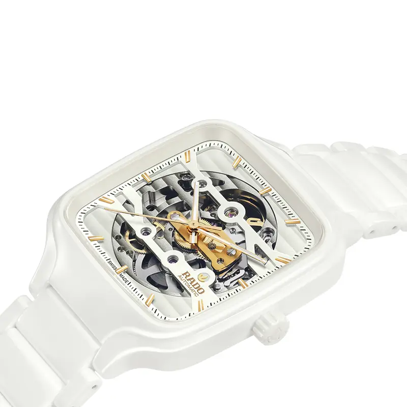 Was bei ihr sofort ins Auge fällt, sind das skelettierte R808 Uhrwerk und das Zifferblatt mit zwei Ebenen, das übergangslos in das Uhrwerk übergeht. Dieses hochmoderne Automatikwerk bietet eine herausragende Präzision, kombiniert mit einer besseren Beständigkeit gegenüber Magnetfeldern und Temperaturschwankungen. Ausserdem verfügt die Uhr über eine Gangreserve von 80 Stunden. Die gelbgoldfarbene Brücke und die nickelfarbige obere Platine sind farblich perfekt auf den vertikal gebürsteten weissen Hintergrund abgestimmt. Mit ihrem 38 mm grossen Monobloc-Gehäuse und ihrem Armband aus polierter weisser Hightech-Keramik bietet die True Square Skeleton typische Rado Merkmale in einer faszinierenden Form.