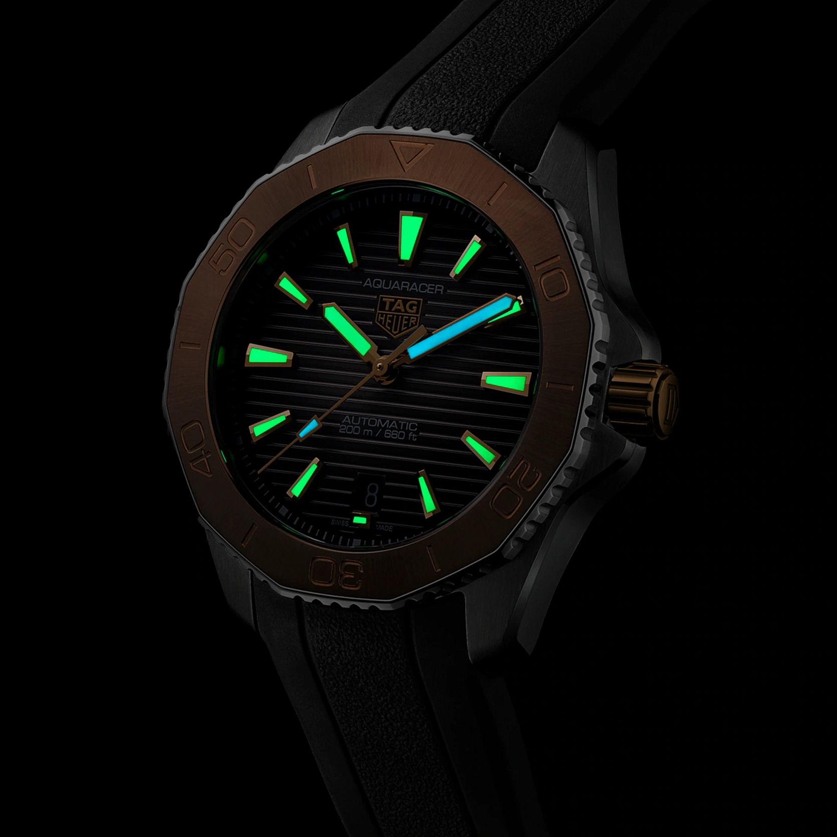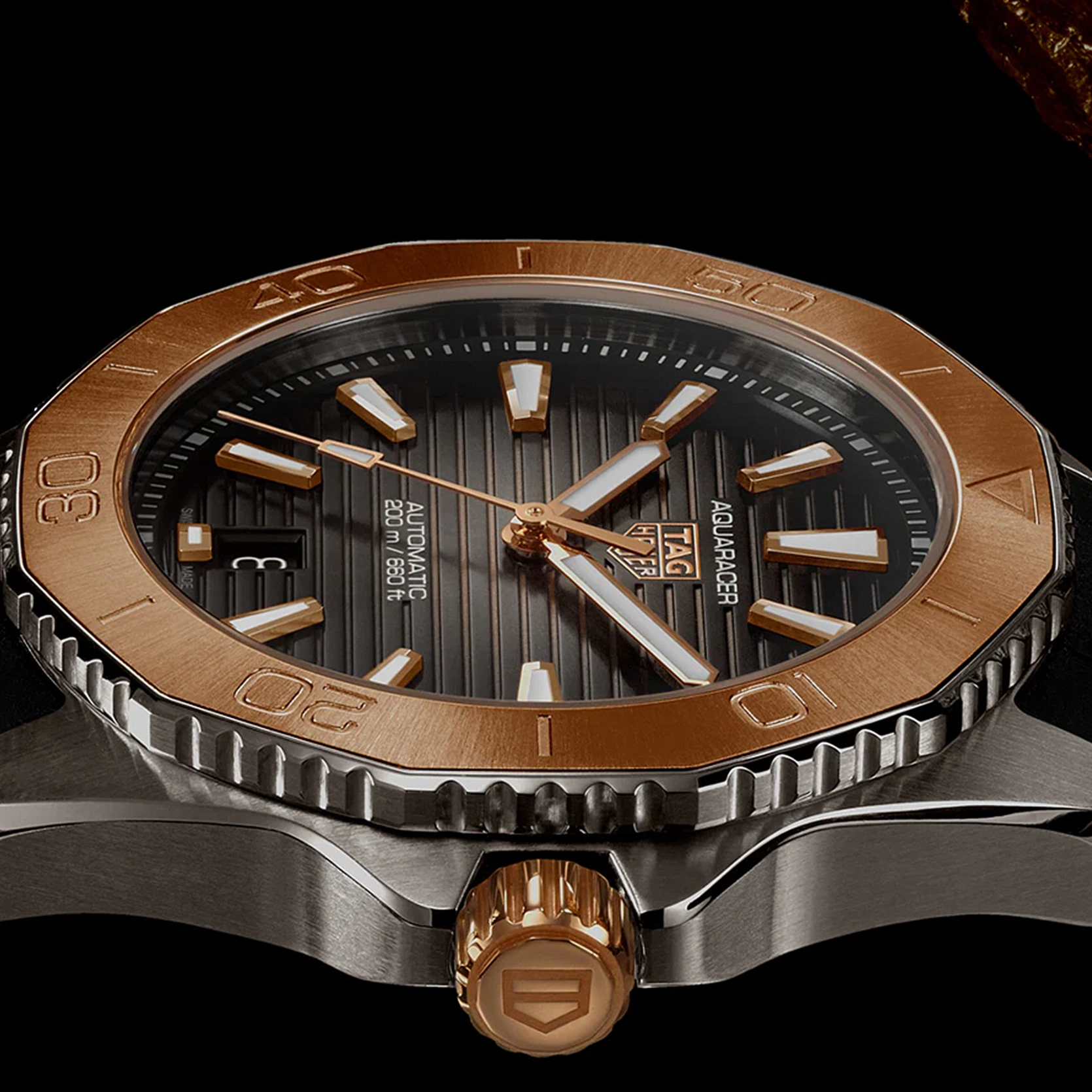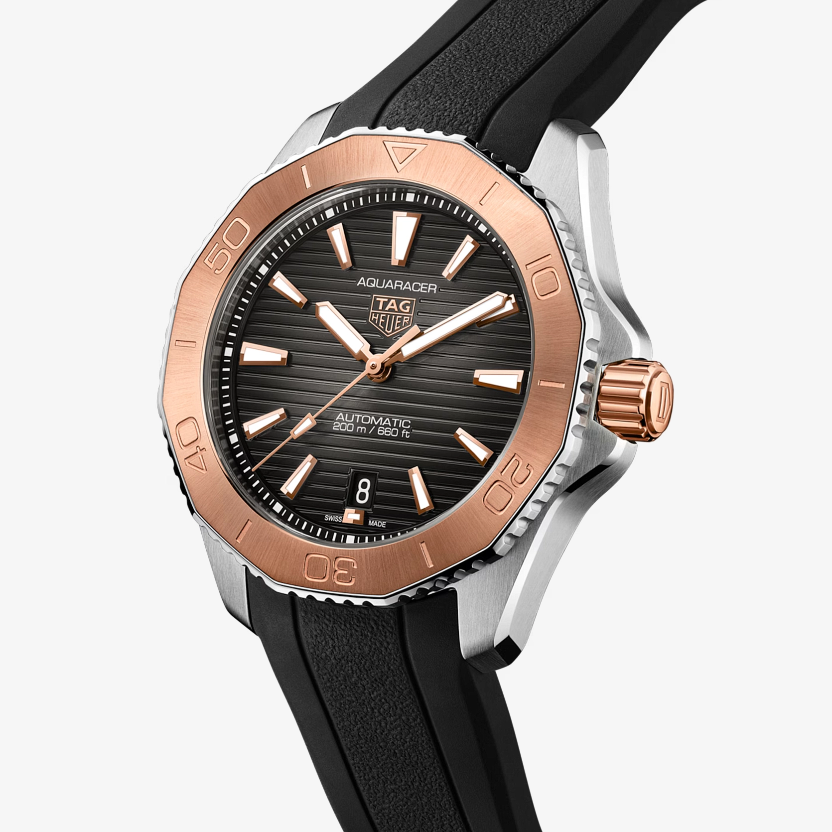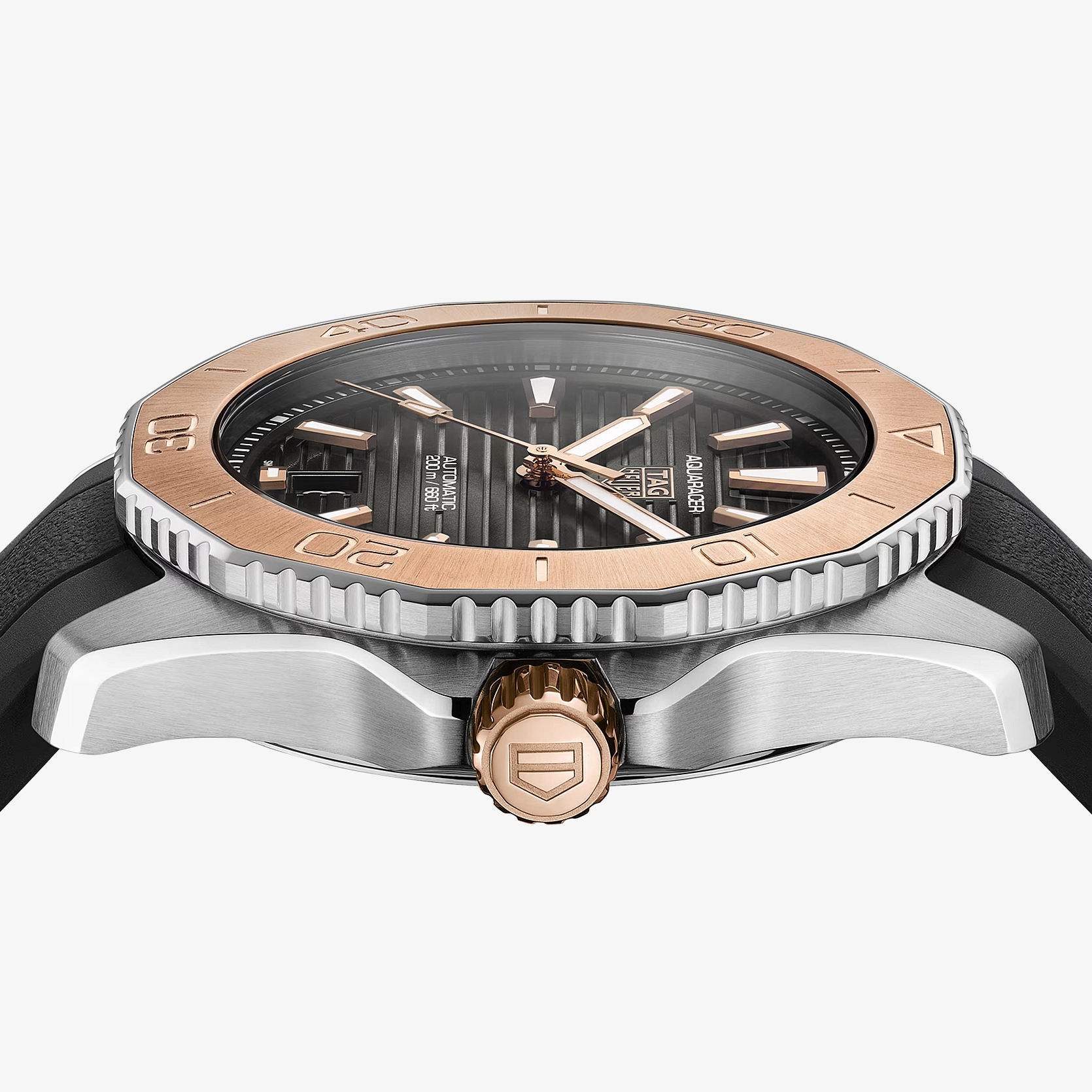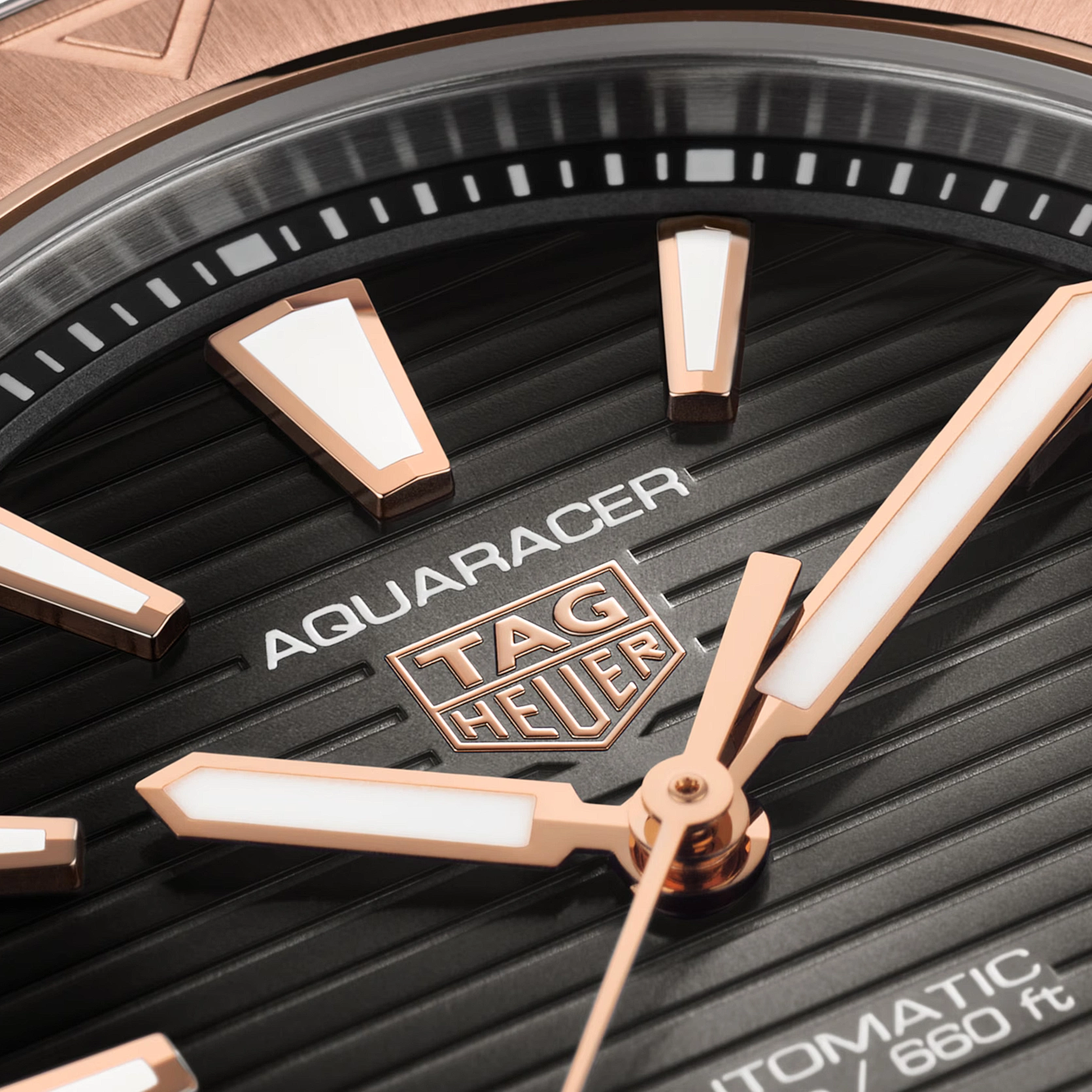 Ref. WBP2151.FT6199 - Bei dieser markanten TAG Heuer Aquaracer trifft Luxus auf extreme Widerstandsfähigkeit. Die verschraubte Krone und der Lünetteneinsatz aus 18 K 5N Roségold kontrastieren wunderschön mit dem rauchschwarzen Zifferblatt, das mit gut ablesbaren Zeigern und Markierungen verziert ist. Eine Uhr, die für jede Errungenschaft geschaffen ist.