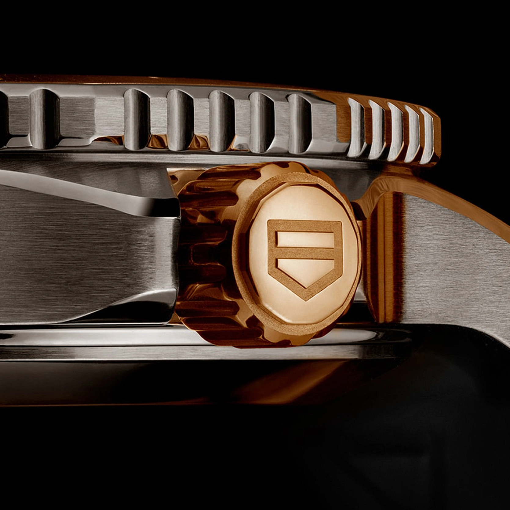 Das zeitlos elegante tiefschwarze Zifferblatt ist dank der kontrastierenden, mit 18 K 5N Roségold beschichteten Zeiger und Markierungen bei Tag und Nacht sehr gut ablesbar. Die luxuriöse, einseitig drehbare Lünette aus massivem 18 K 5N Roségold, die das schwarze Zifferblatt umgibt, und die dazu passende verschraubte Krone bieten eine außergewöhnliche Widerstandsfähigkeit. Passend zum Zifferblatt ist das dunkelschwarze Kautschukarmband mit einer widerstandsfähigen Edelstahlschließe und einem verstellbaren Verlängerungsglied ausgestattet.