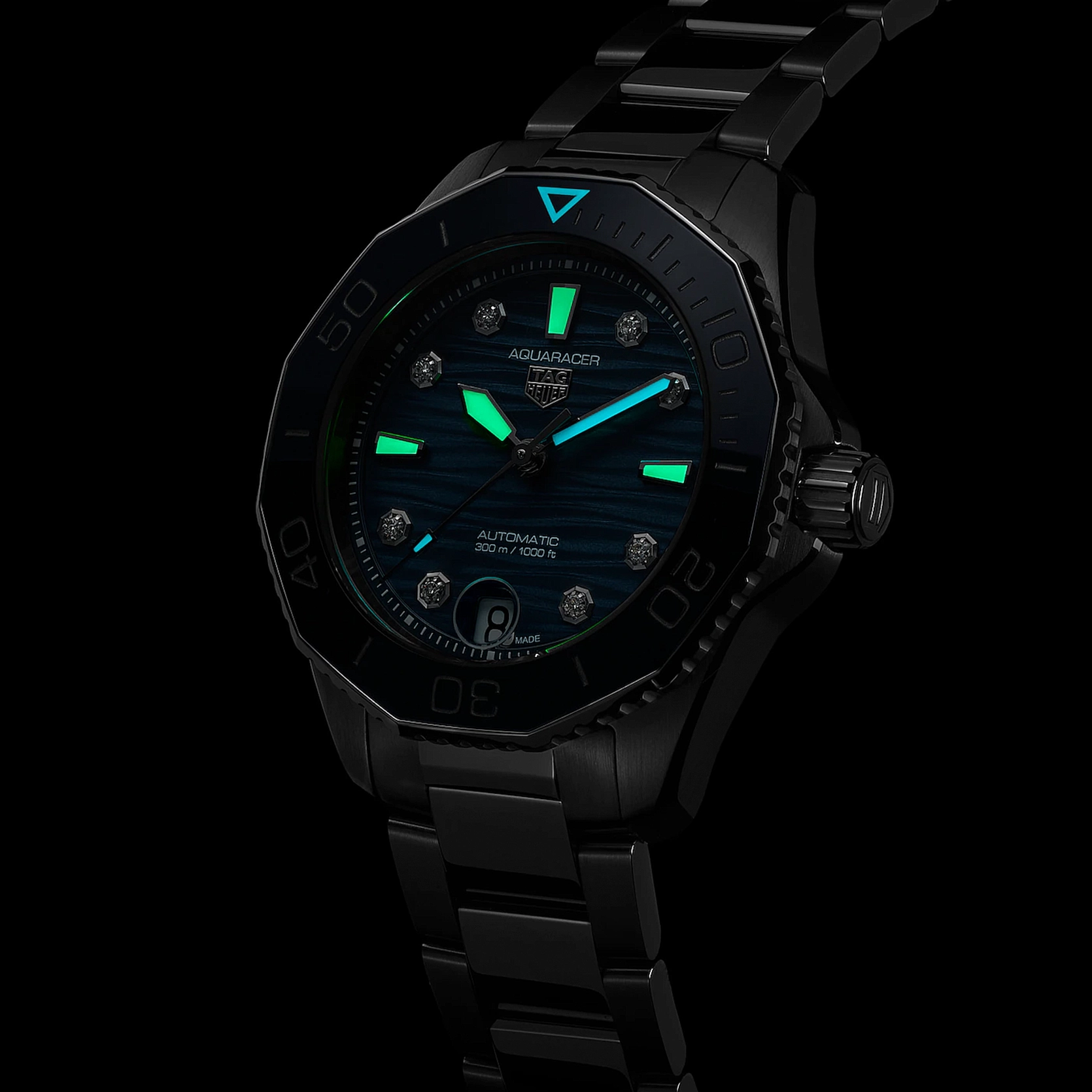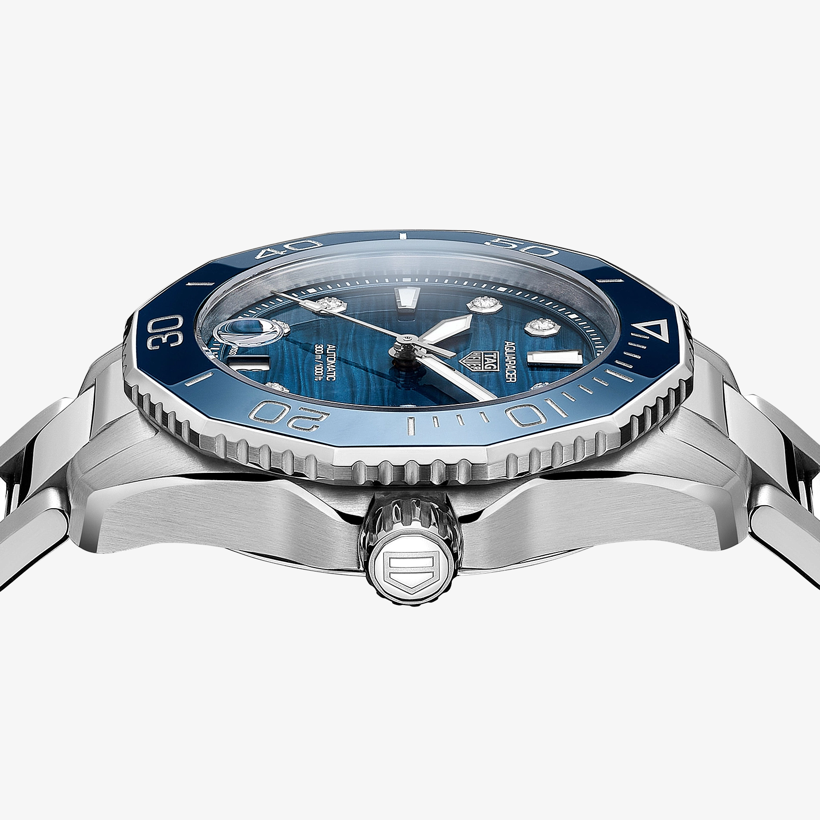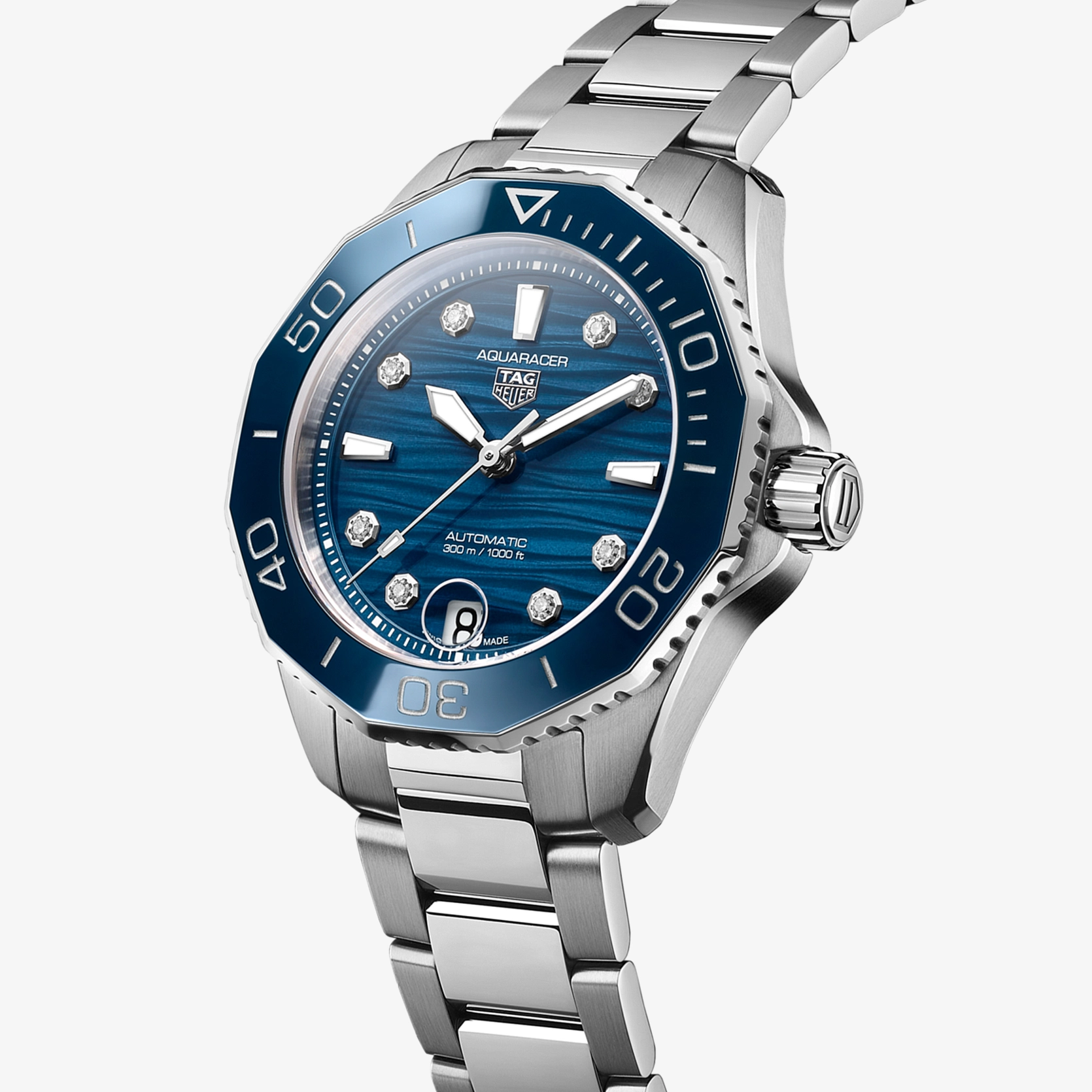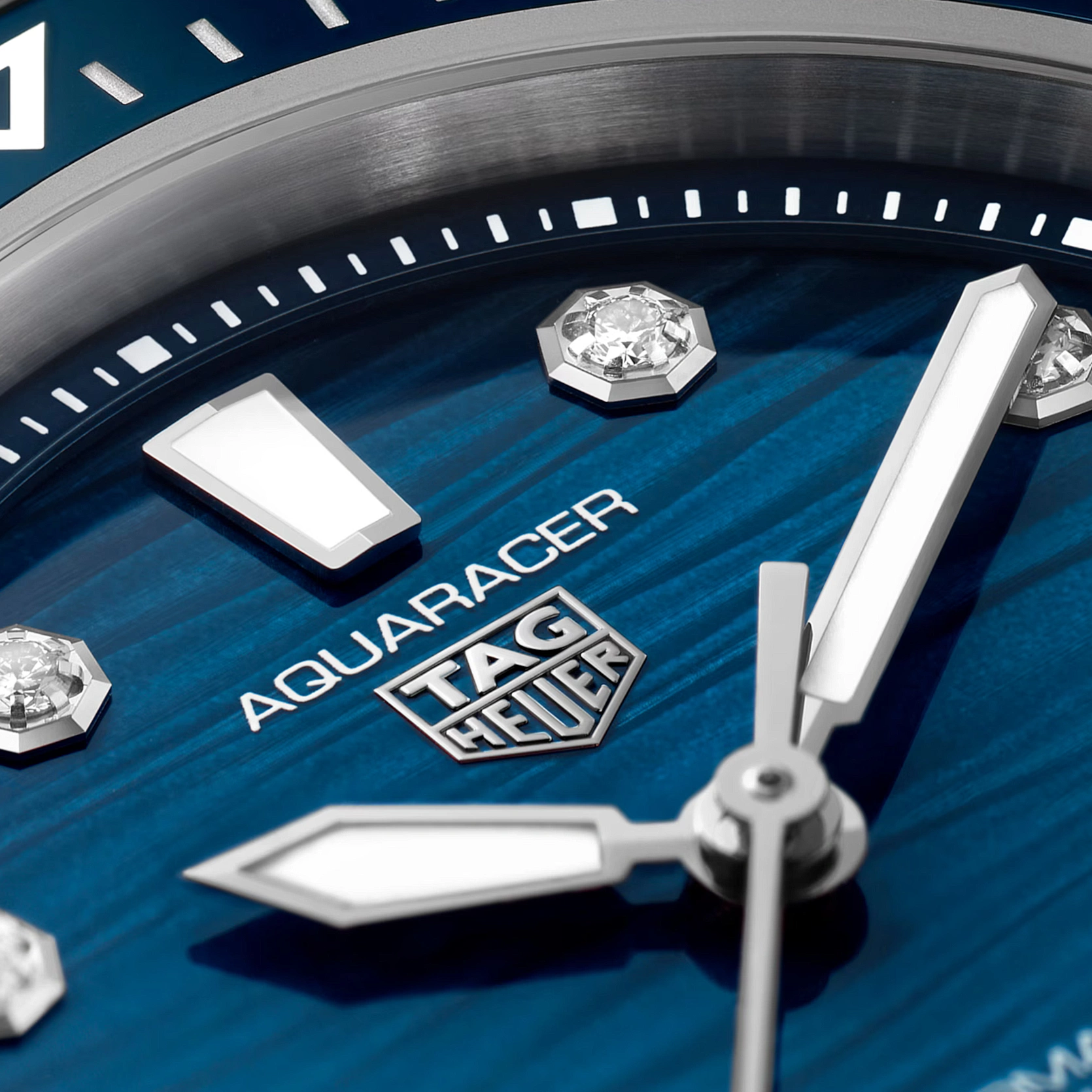 Eine leuchtend blaue einseitig drehbare Lünette aus Keramik ergänzt sich hervorragend mit dem robusten Gehäuse und dem schönen Zifferblatt. 8 elegante VS-Diamanten (0,078 ct) sorgen für zusätzliche Eleganz. Eine 60-Minuten-Skala hilft beim Messen der verstrichenen Tauchzeit. Getreu dem legendären Aquaracer Erbe kombiniert das neue schlanke 36-mm-Gehäuse gebürstete und polierte Oberflächen mit einer präzisen Geometrie. Das druckfeste konische Armband aus Edelstahl wird mit zwei Sicherheitsdrückern an der Schließe gesichert und verfügt über ein Feineinstellsystem. Eine treue Begleiterin für jeden Taucher.