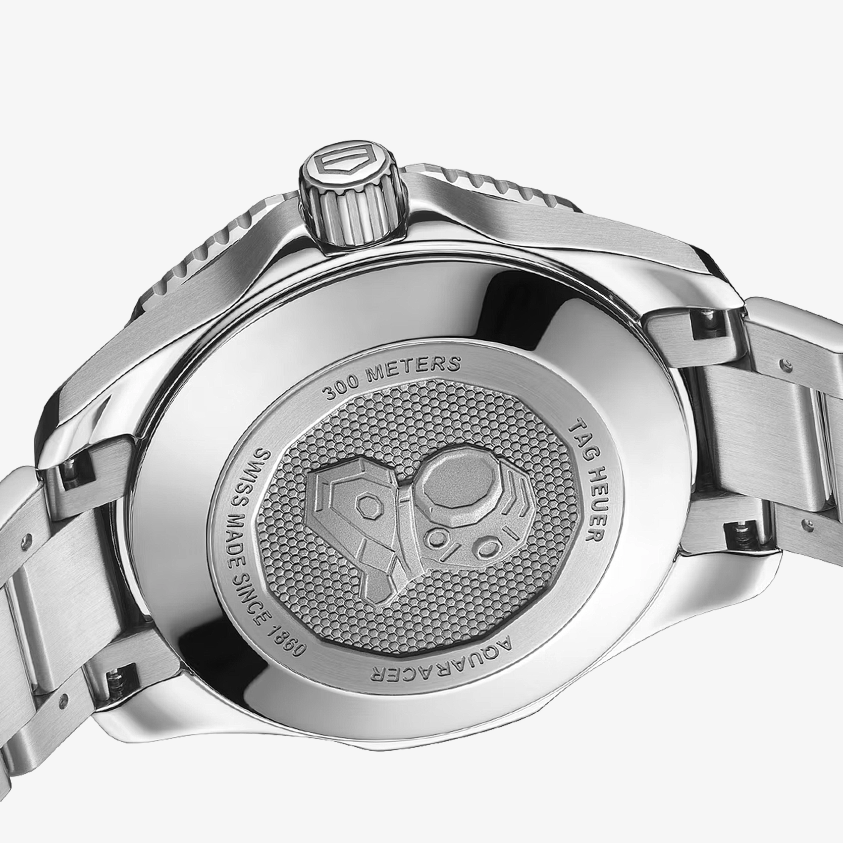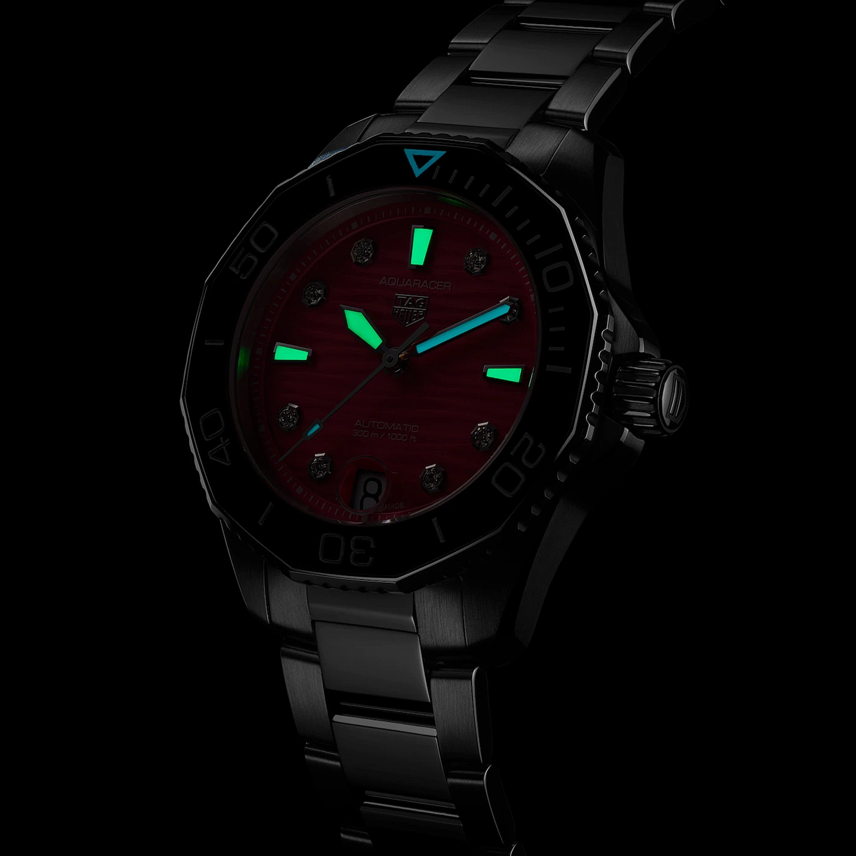 Das Wellenmuster des Zifferblatts der TAG Heuer Aquaracer lenkt mit seiner Farbgebung in kräftigem Rosa alle Blicke auf sich. Die schwarze Keramiklünette schafft einen Rahmen, während die VS-Diamanten mit einem Durchmesser von 1,40 mm und 0,07 ct Akzente setzen. Das robuste und technische 36-mm-Gehäuse aus Edelstahl ist bis 300 Meter wasserdicht und wird vom Automatikwerk Calibre 5 angetrieben. Das dünne, konisch zulaufende Edelstahlarmband mit Feinregulierung garantiert aboslute Zuverlässigkeit.