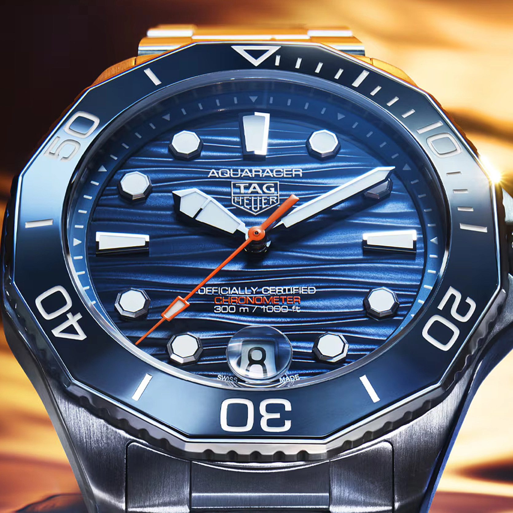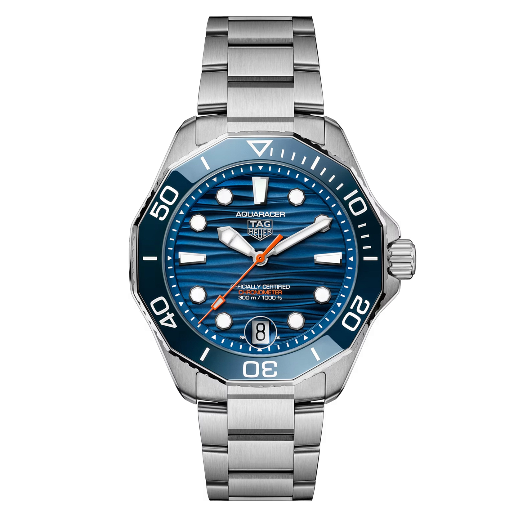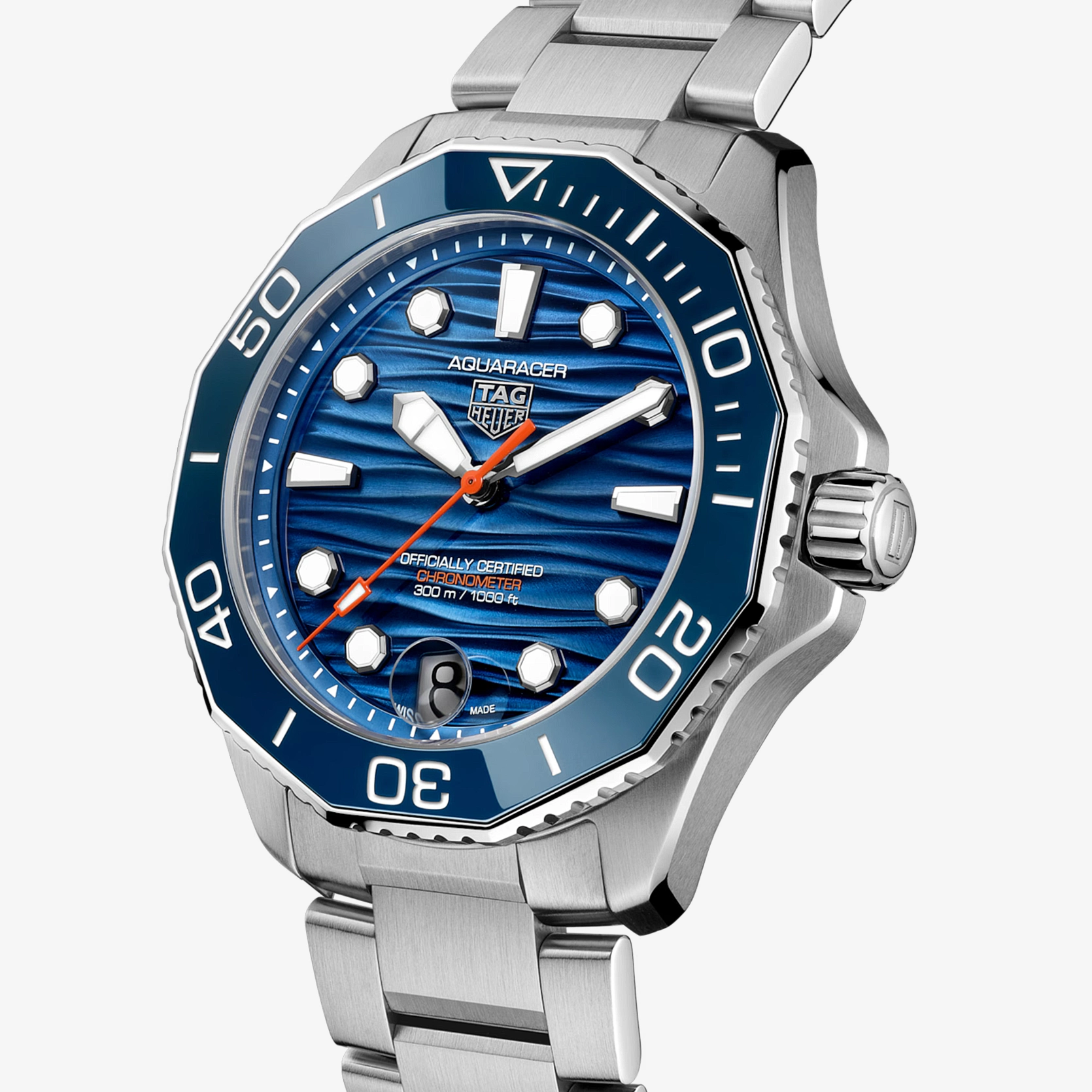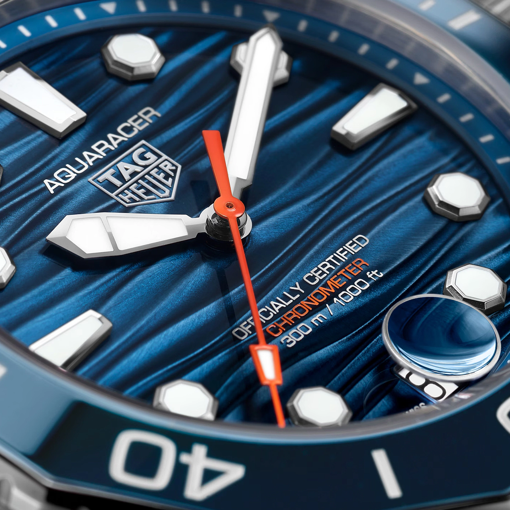 Das blaue Zifferblatt mit Wellenmuster erinnert an die Schönheit der Unterwasserwelt. Es ist mit weißen Super-LumiNova®-Zeigern und Indizes versehen, die für optimale Ablesbarkeit von einem leuchtend orangefarbenen, zentralen Zeiger ergänzt werden. Das fein gebürstete, polierte Edelstahlgehäuse ist mit einer blauen Keramiklünette mit 60-Minuten-Skala versehen. Die einseitig drehbare Lünette bietet eine fortschrittliche Ergonomie und eine angenehme Haptik beim Drehen. Das dreireihige Edelstahlarmband ist ebenso robust wie elegant. Die ebenfalls aus Edelstahl gefertigte Faltschließe mit doppelten Sicherheitsdrückern sorgt für Komfort, wann immer es darauf ankommt.