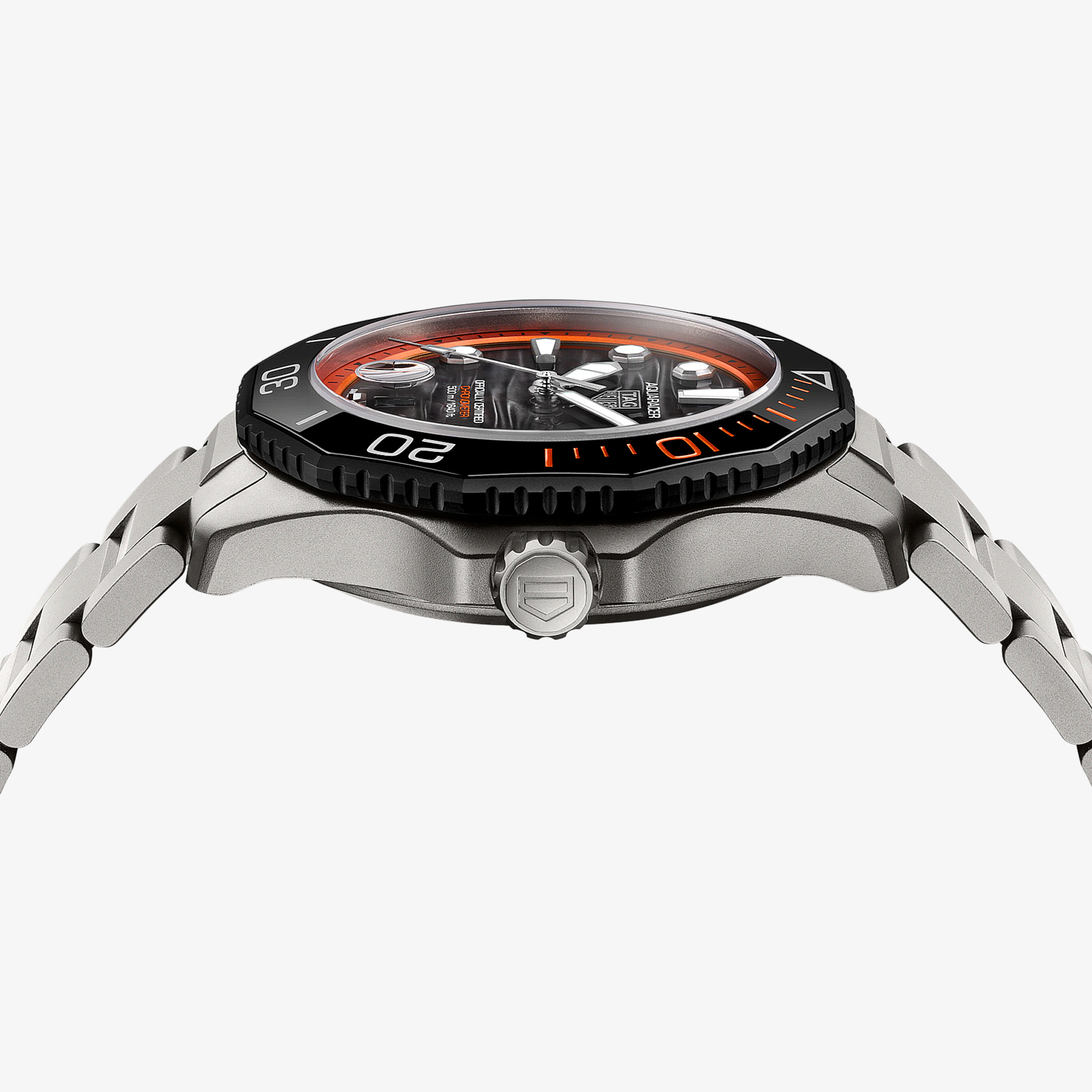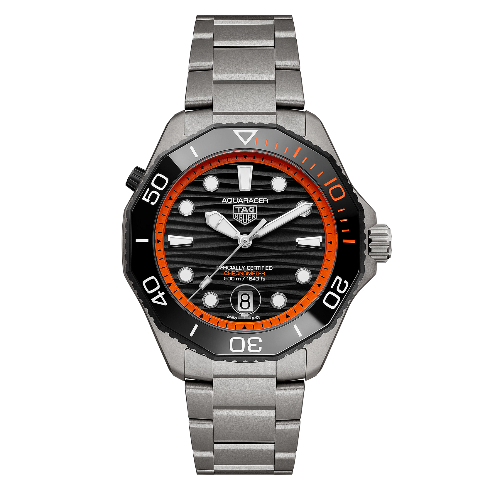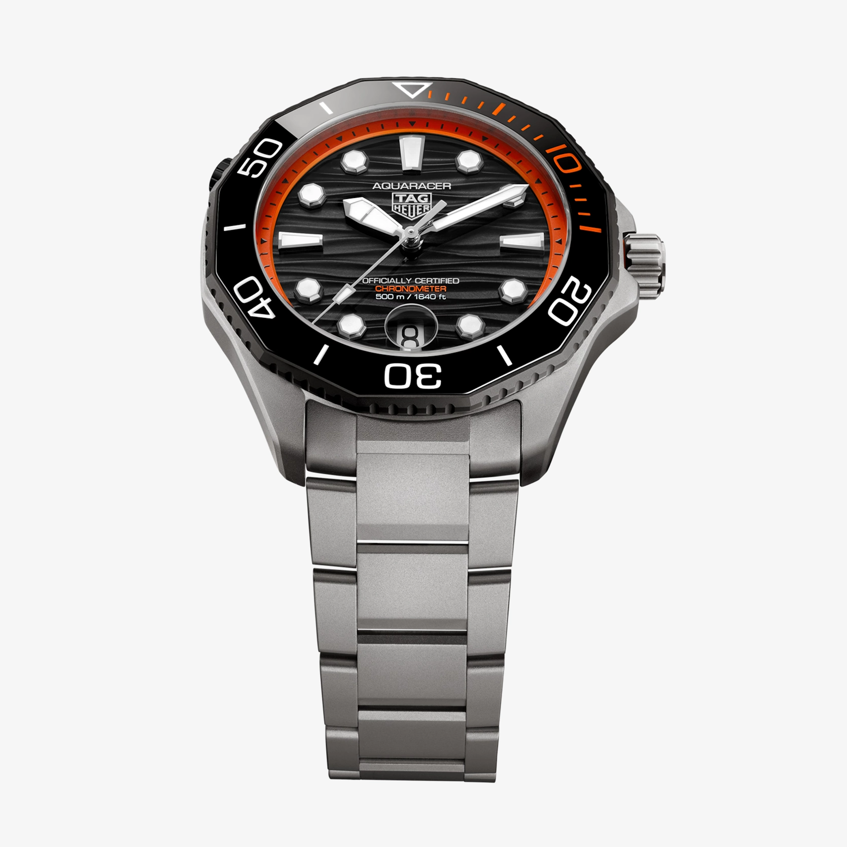 Ref. WBP5183.BF0010 - Die TAG Heuer Aquaracer Professional 500 Date ist Ausdruck höchster Tauchkompetenz und vereint extreme Widerstandsfähigkeit mit lebhaftem Charakter. Sie ist aus ultraleichtem Titan Grad 2 gefertigt und bis zu einer Tiefe von 500 Metern wasserdicht. Damit erfüllt sie die Anforderungen der Tiefseeforschung mit professioneller Präzision und einem unverkennbaren Sinn für Abenteuer. Das schwarz lackierte Zifferblatt bildet einen optimalen Kontrast zum orangefarbenen Zifferblattring. Die rhodinierten Zeiger und Indizes mit weißer SuperLumiNova®-Beschichtung versprechen eine zuverlässige Ablesbarkeit, während das vergrößerte Datumsfenster bei 6 Uhr und die markanten orangefarbenen Akzente das leistungsorientierte Design akzentuieren.