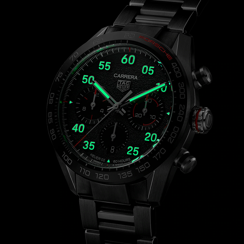 Dieser wegweisende Zeitmesser ist mit einem ineinandergreifenden Armband ausgestattet, das das elegante Rennsportdesign aufgreift. Die unverkennbare Schriftart des eingravierten Porsche-Schriftzugs auf der Lünette findet sich in den Indizes wieder.