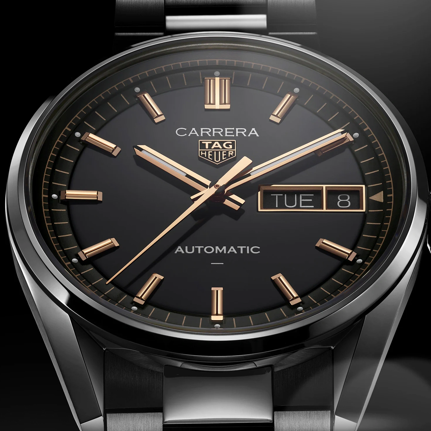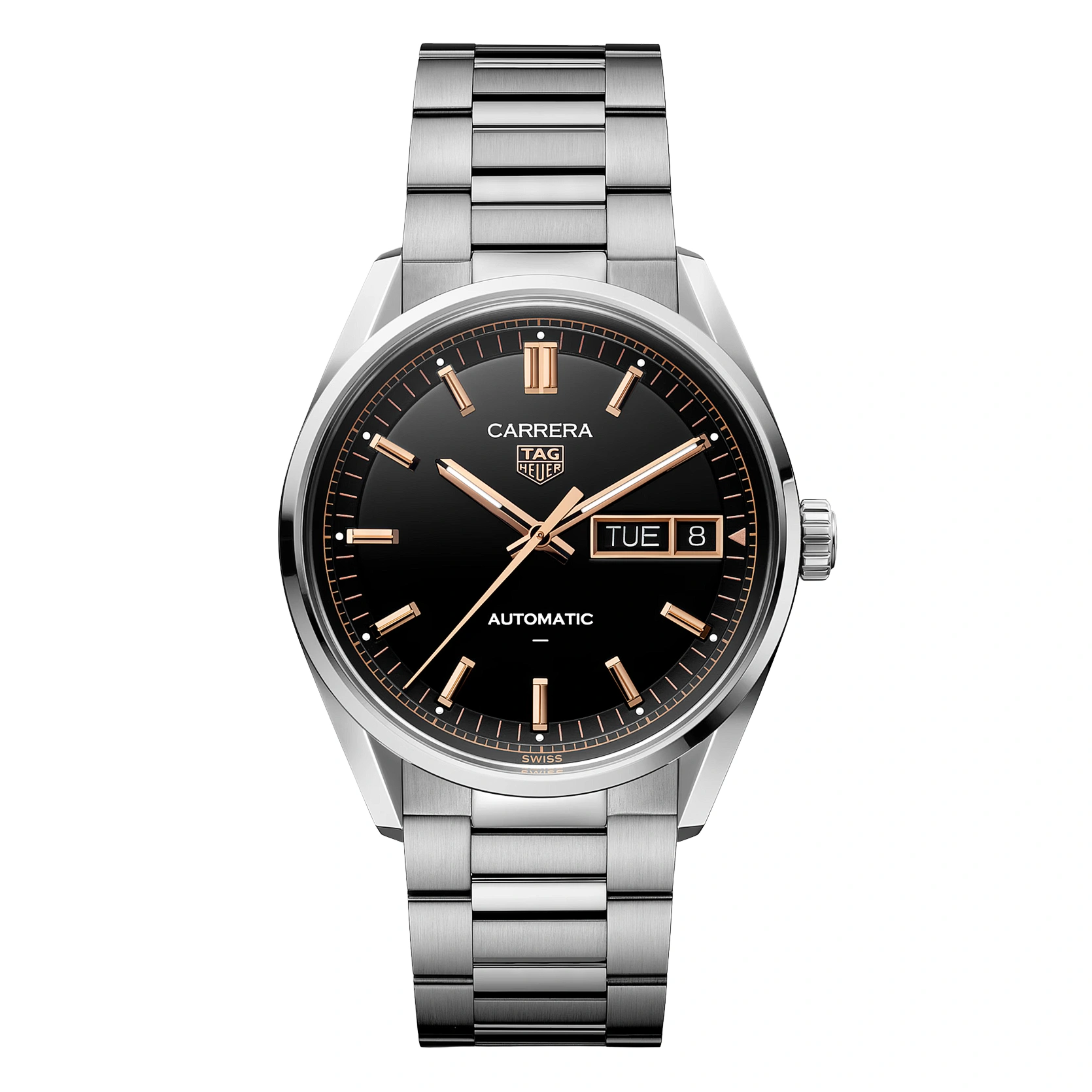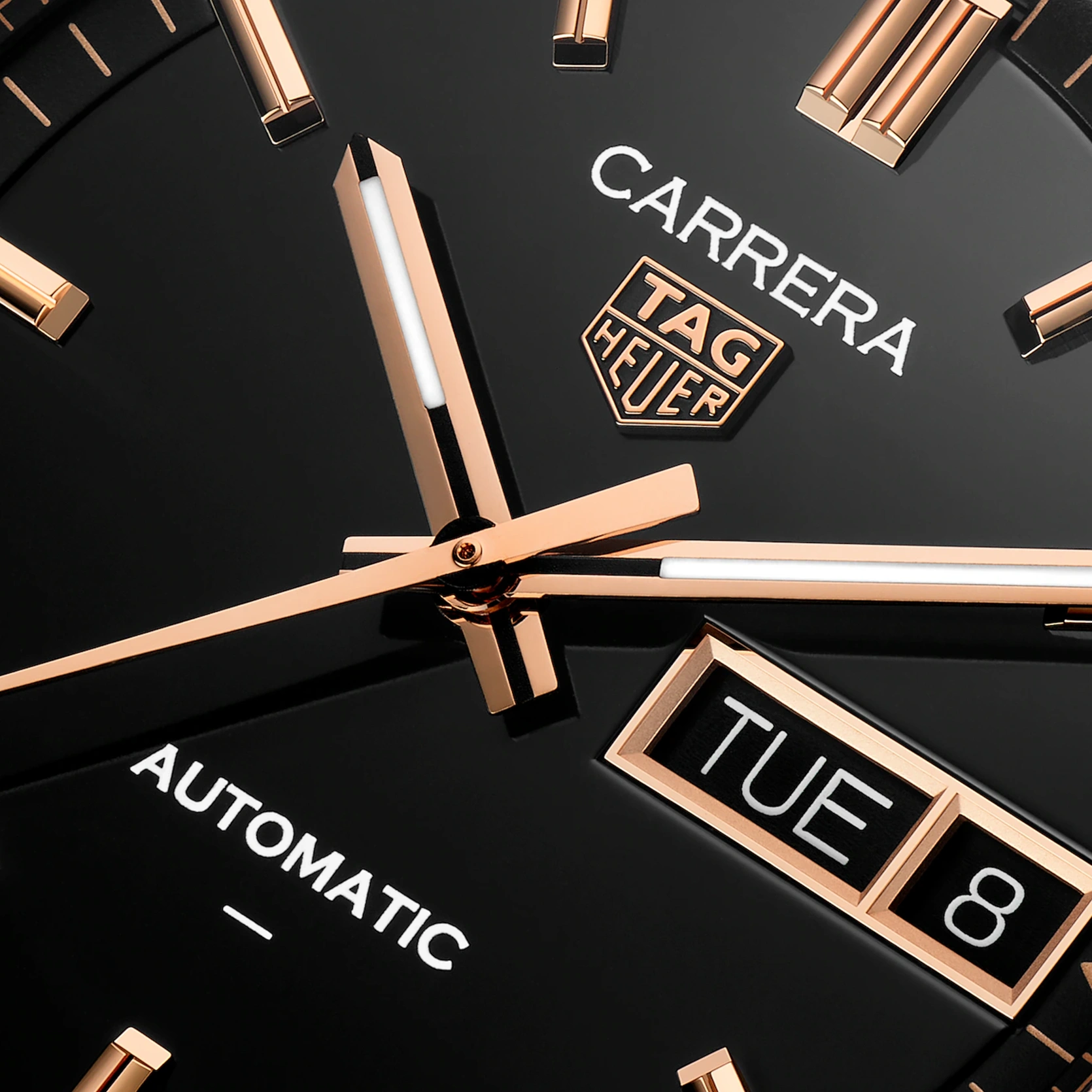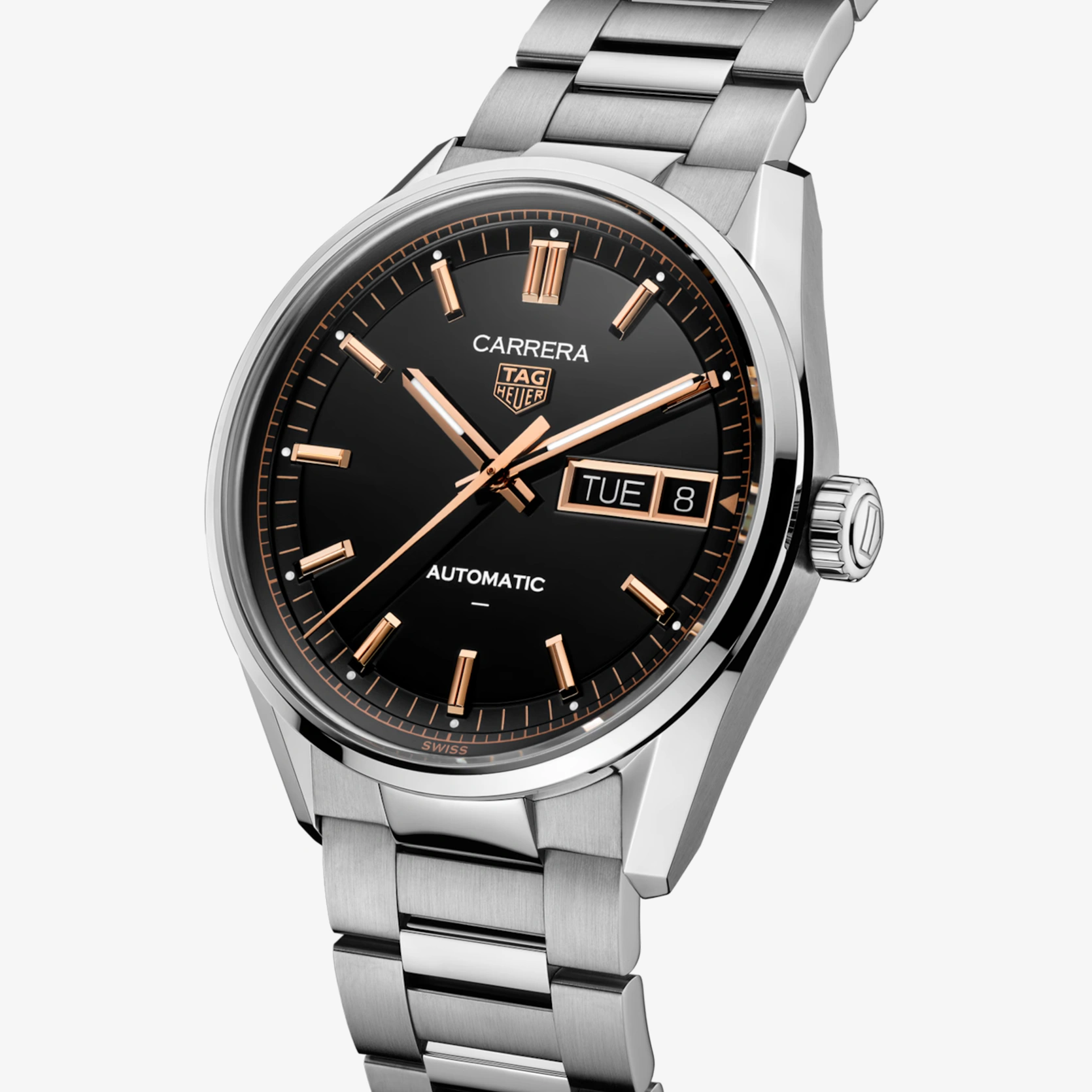 Ref. WDA2111.BA0043 - Entscheiden Sie sich für die stilvolle TAG Heuer Carrera Day-Date mit dem fein gebürsteten 41-mm-Gehäuse aus Edelstahl und dem raffinierten, schwarz opalisierenden Zifferblatt mit kontrastierenden, in 18 K Roségold (5N) vergoldeten Akzenten. Dieser Zeitmesser wird von dem Calibre TH31-02 angetrieben und ist ein Musterbeispiel für Präzision und Eleganz.