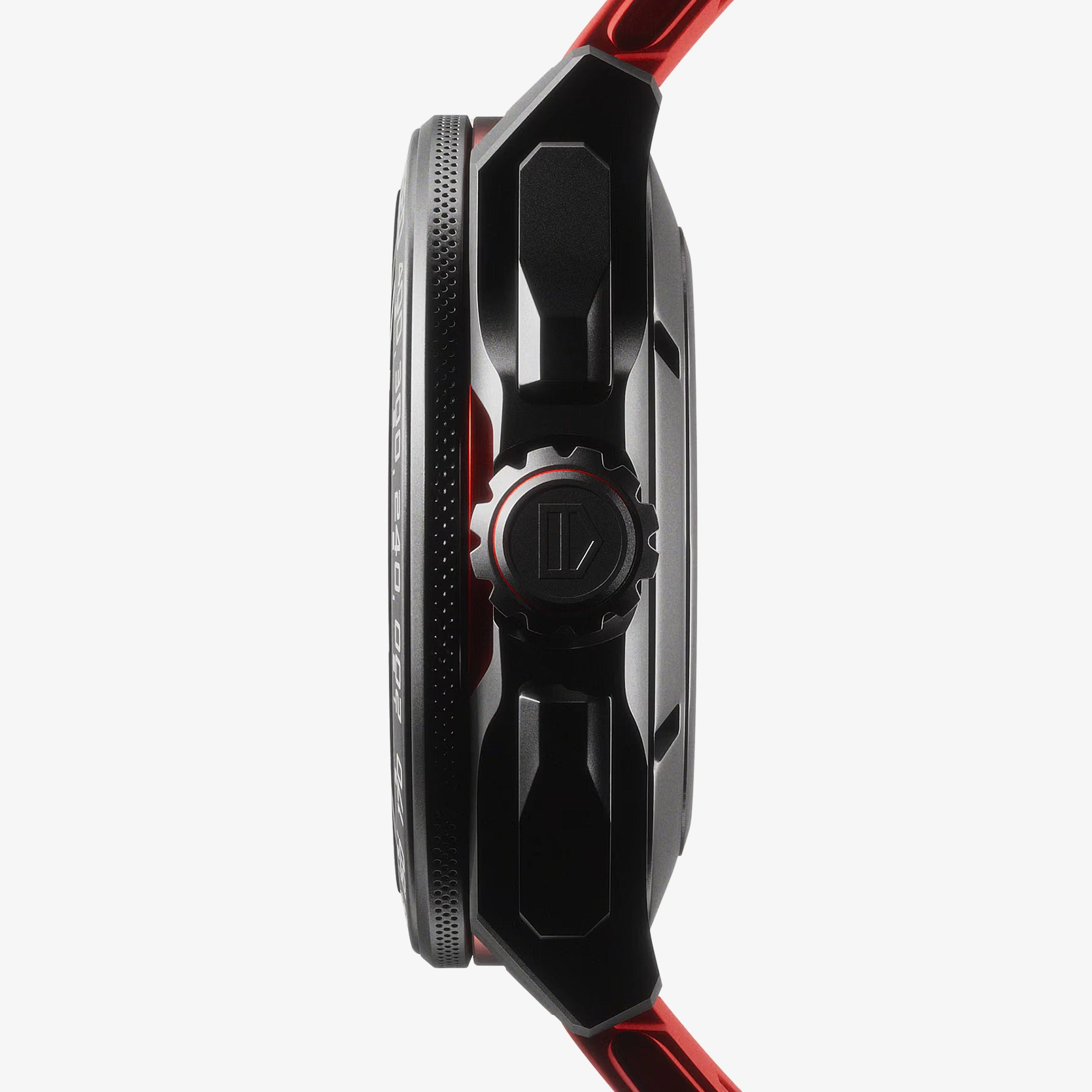 Das schwarze opalisierende Zifferblatt wird durch einen rot lackierten Ring abgerundet, der an die kinetische Energie eines Rennens erinnert. Die Leuchtzeiger und -indizes garantieren selbst bei schlechten Lichtverhältnissen eine optimale Ablesbarkeit. Das sandgestrahlte Gehäuse aus Titan Grad 2 verspricht Robustheit. Mit einer Wasserdichtigkeit bis 200 Meter und einem roten Kautschukarmband ist die Uhr für jedes Abenteuer gerüstet. Mit seinem Automatikwerk Calibre 16 garantiert der Chronograph hohe Leistung und Genauigkeit. In der Krone und den Drückern aus Titan Grad 2, die das dynamische Design abrunden, spiegelt sich die historische Verbindung zum Rennsport wider.