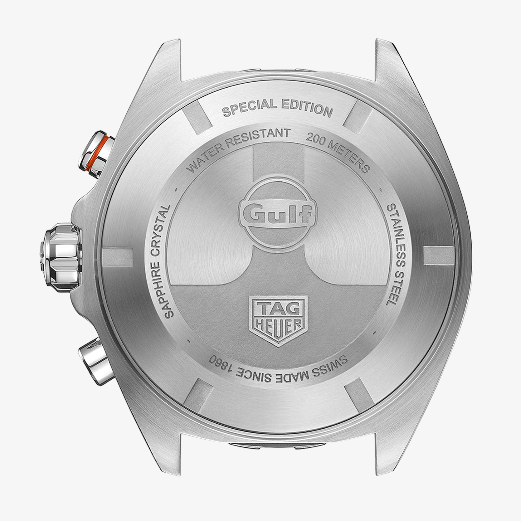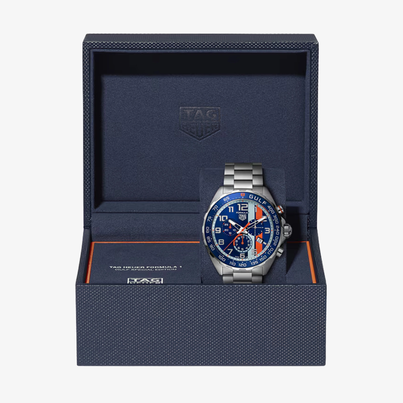Die augenblicklich erkennbaren, blau-orangefarbenen Streifen von Gulf auf dem sportlich blauen Zifferblatt mit Sonnenschliff und den Hilfszifferblättern sind ein echter Blickfang. Die Farben des Sieges. Der robuste, verschraubte Gehäuseboden aus fein gebürstetem Edelstahl ist mit einer besonderen Gravur versehen, die der Uhr eine einzigartige Aura verleiht. Das dreireihige Edelstahlarmband eignet sich mit seiner Faltschließe mit doppeltem Sicherheitssystem und der Verlängerung für den Rennanzug perfekt für echte Abenteurer. Diese Box wurde speziell für die TAG Heuer Formula 1 Gulf Edition entworfen und ist der ideale Aufbewahrungsort für dieses originelle Meisterwerk.