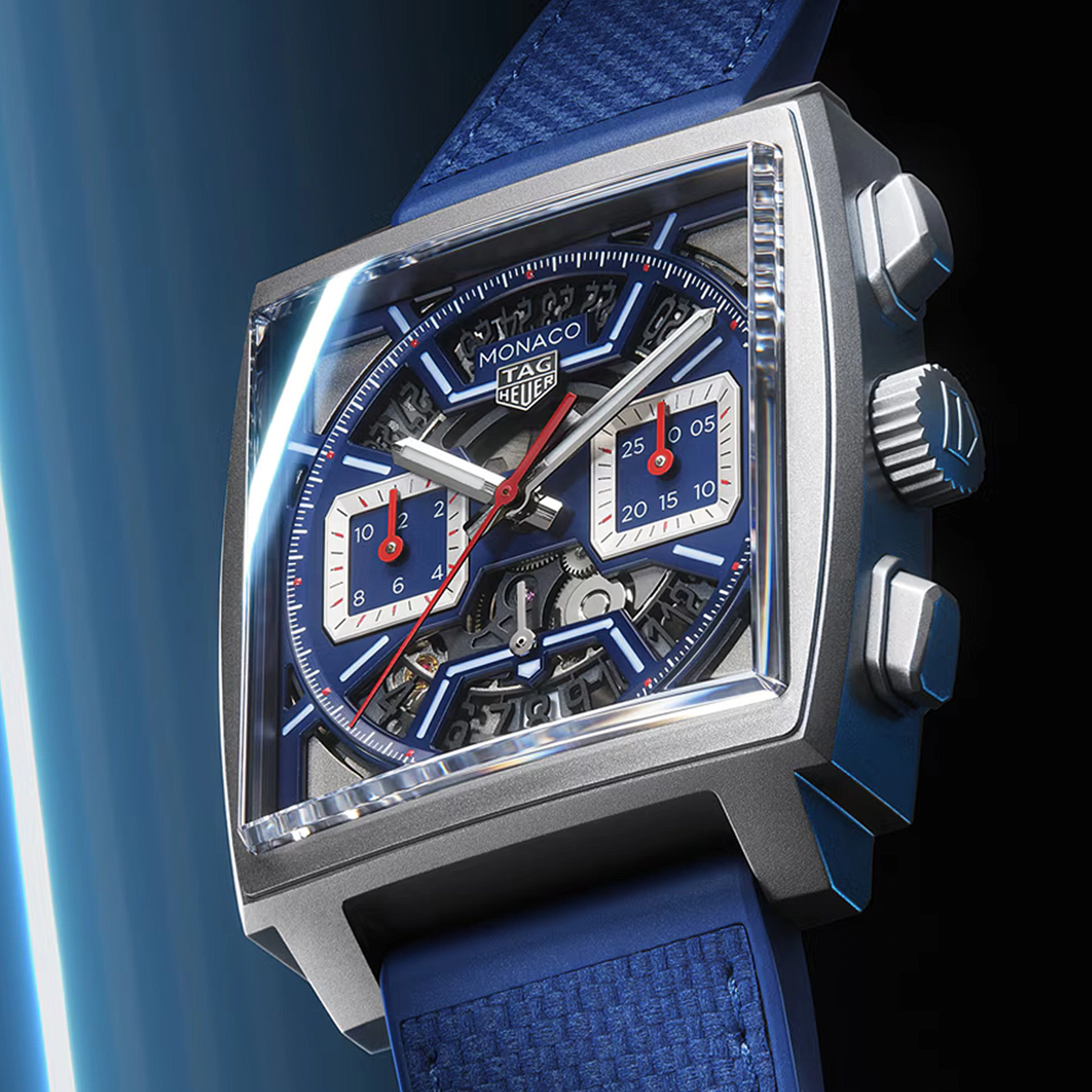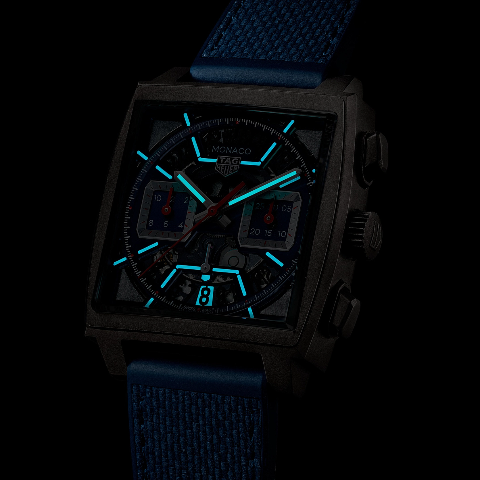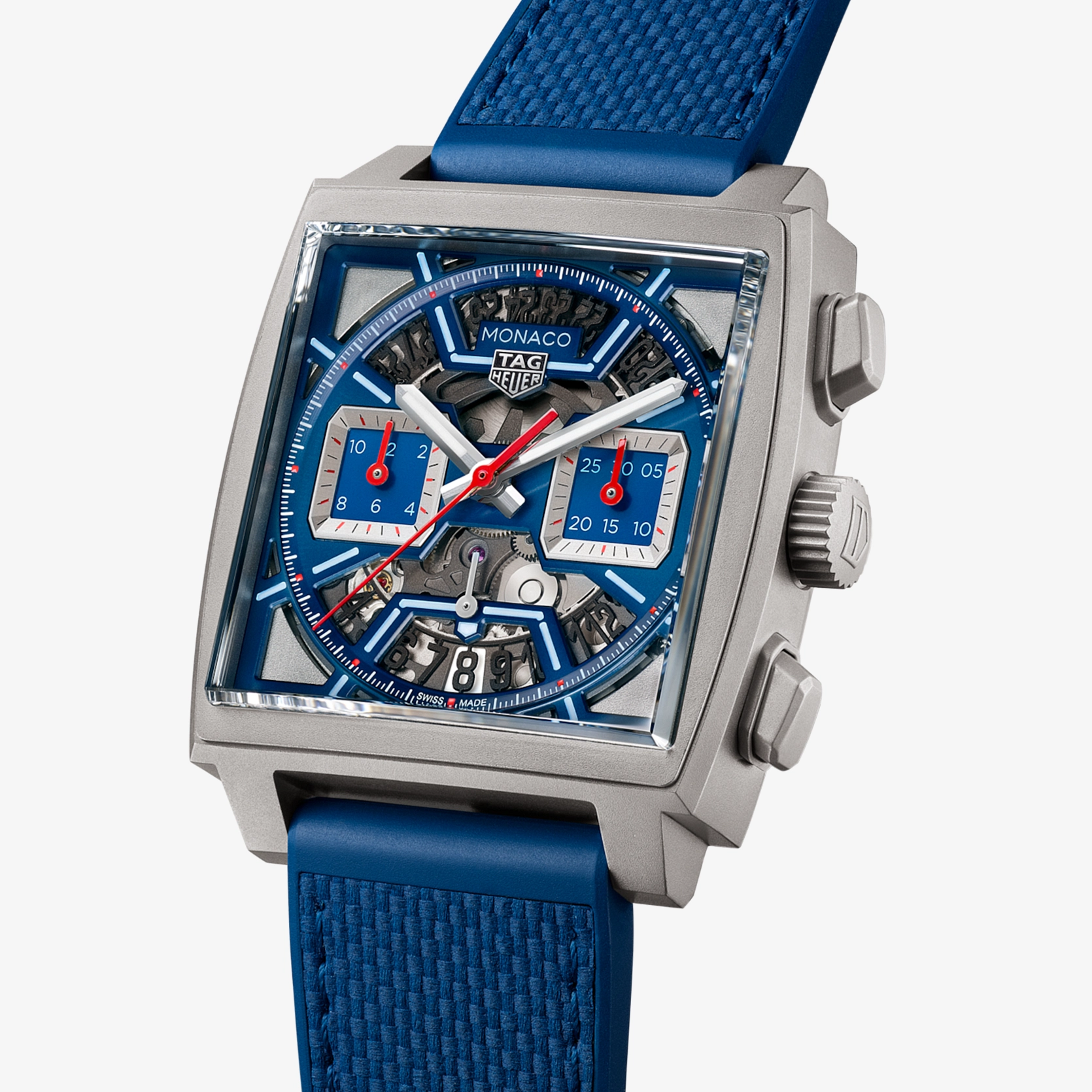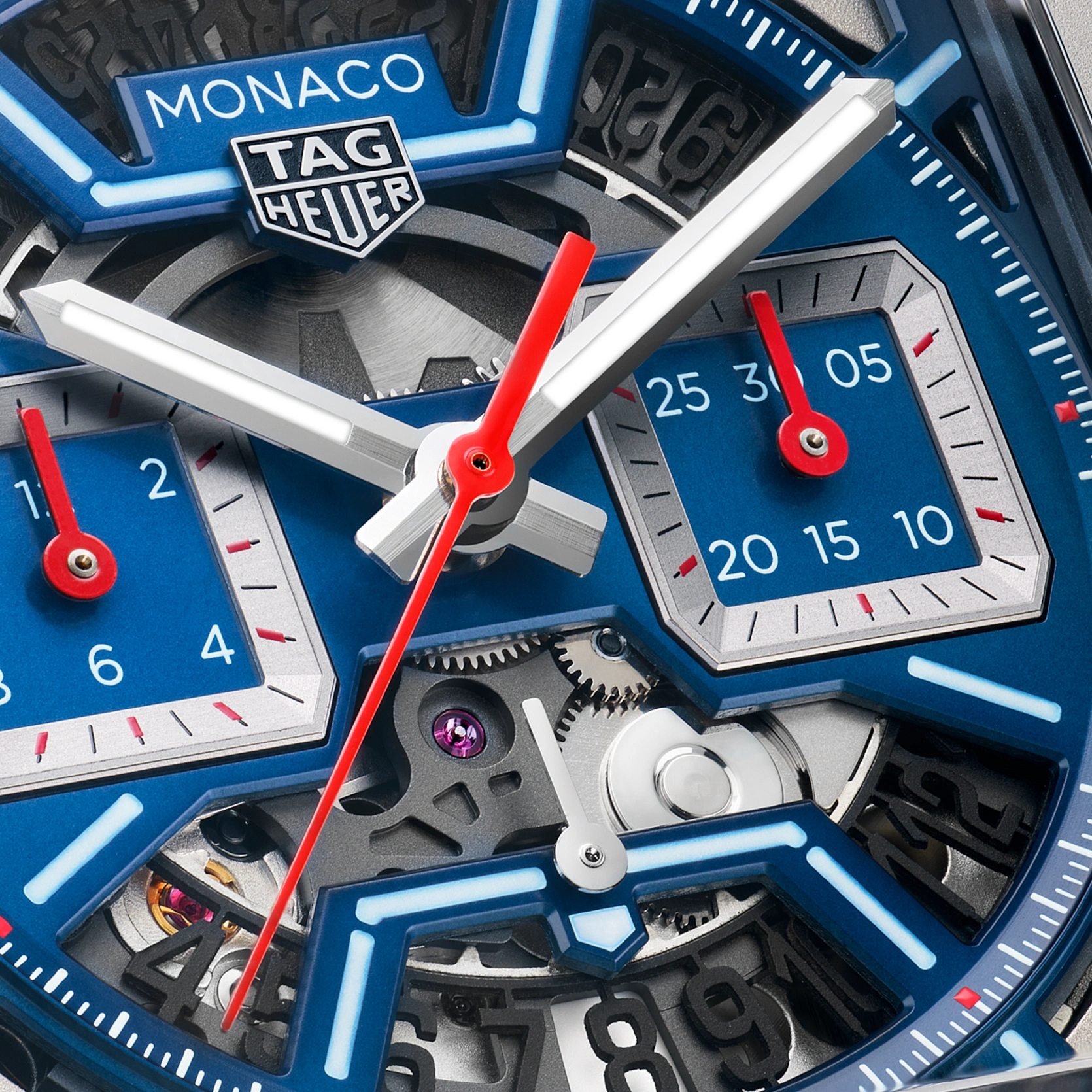 In einer Hommage an das ursprüngliche Farbschema der TAG Heuer Monaco zeigt das skelettierte Zifferblatt in kühlem Blau eine einzigartige Kombination von roten und weißen Akzenten. Das Armband aus blauem geprägtem Leder und Kautschuk, das zum ersten Mal auf einer TAG Heuer Monaco zu sehen ist, sitzt sportlich auf dem Handgelenk und ist vielseitig einsetzbar.