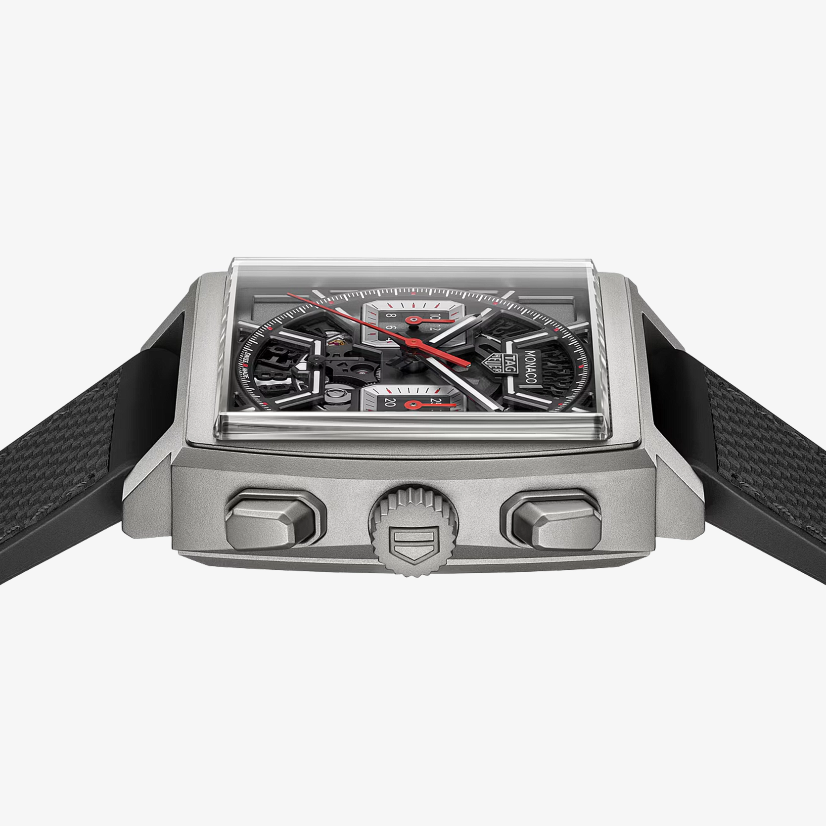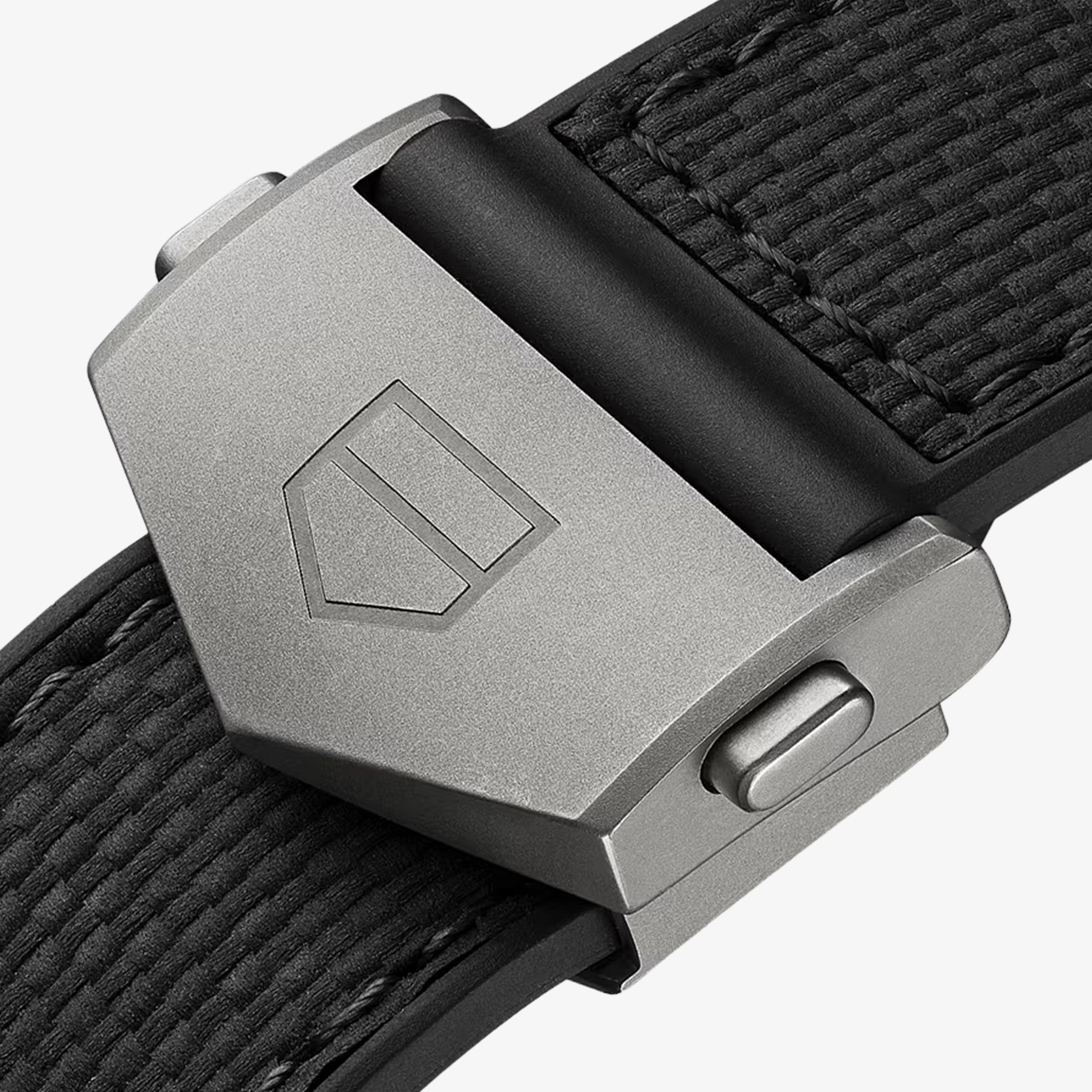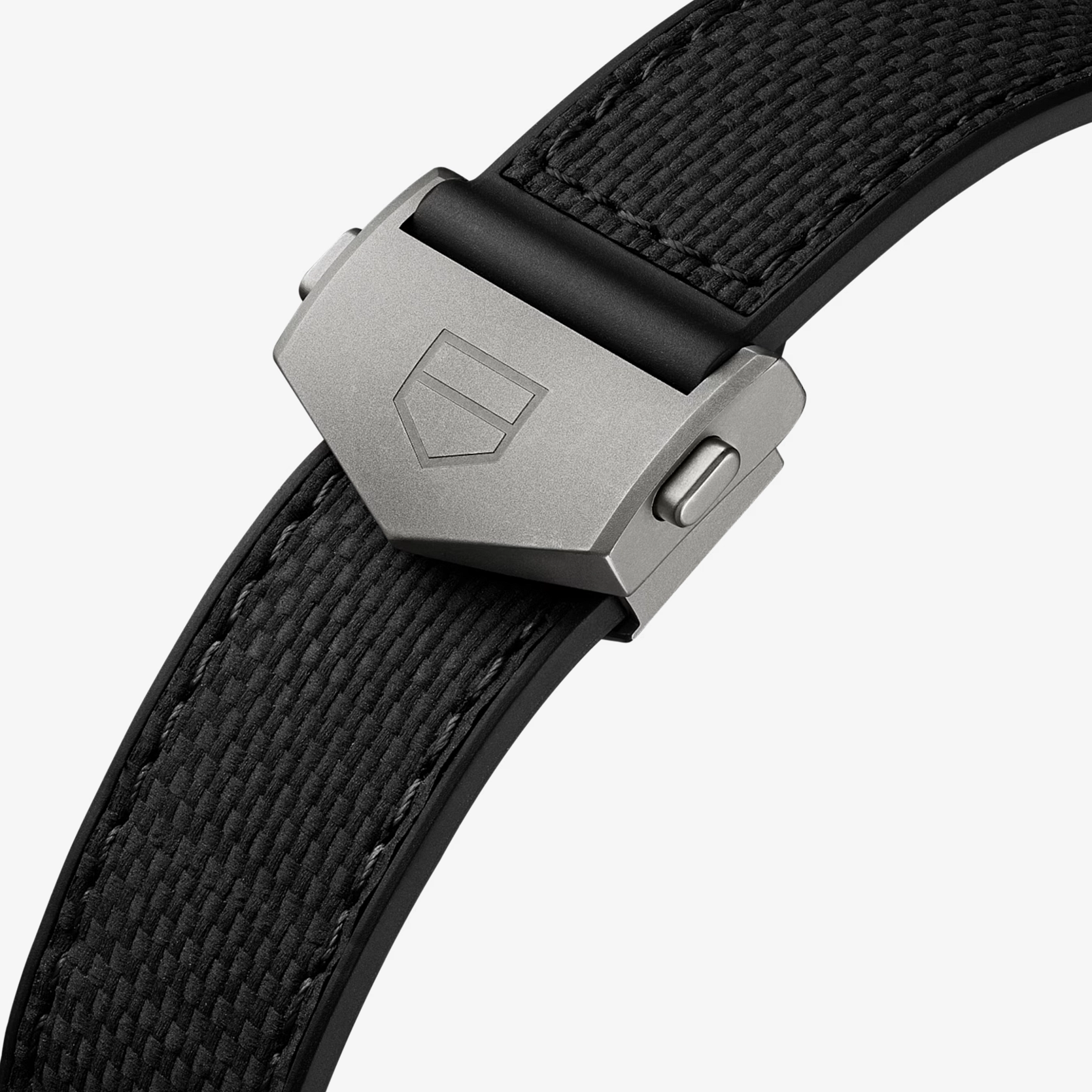 Das extrem leichte und technische 39-mm-Gehäuse aus Titan Grad 2 integriert das zuverlässige Automatikwerk Calibre Heuer 02. Die beste Verbündete eines Rebellen. Luxuriös und widerstandsfähig vereint das geprägte schwarze Armband in perfekter Harmonie die Eleganz des Leders mit der Robustheit des Kautschuks.