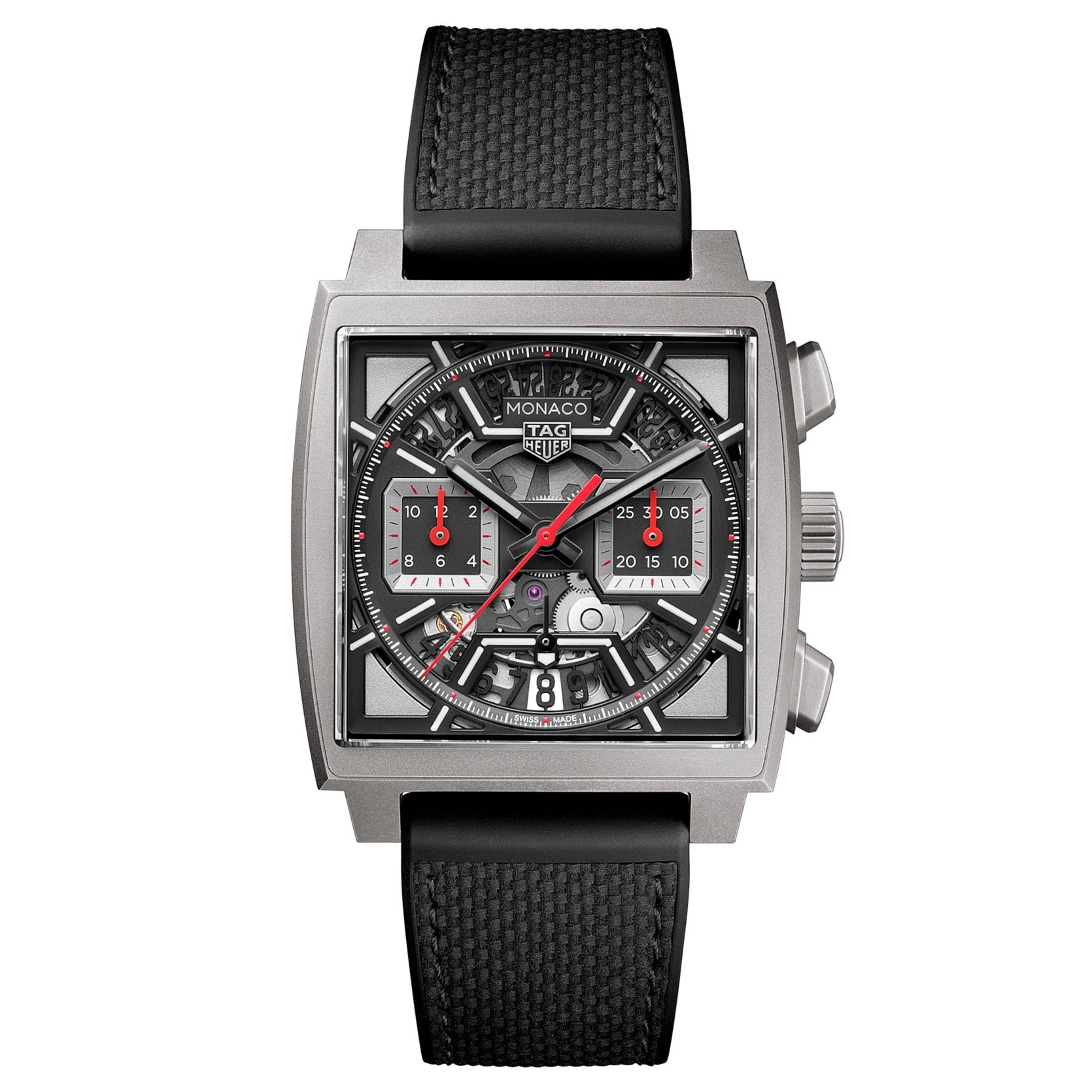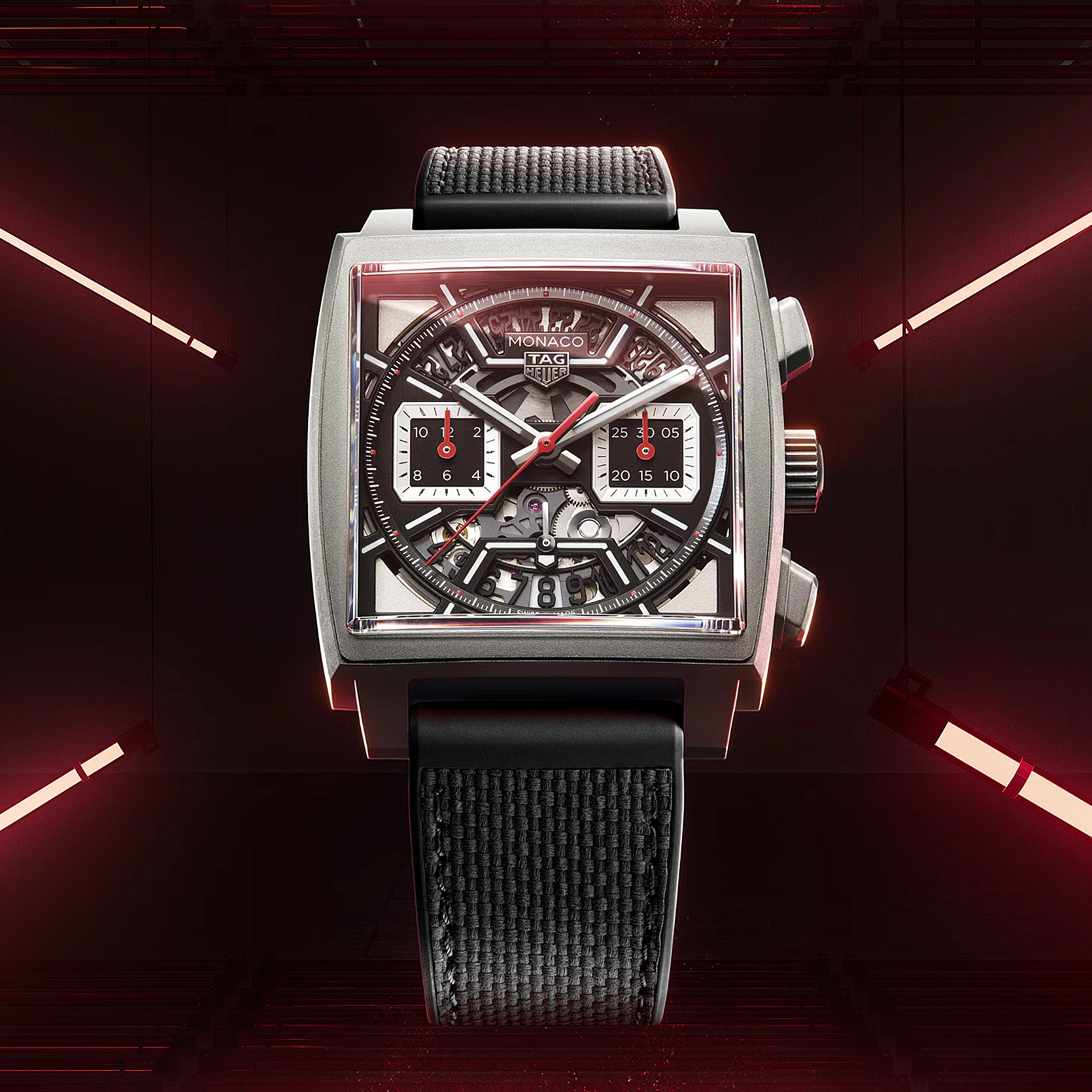 Die leuchtend roten und weißen Hervorhebungen auf dem sandgestrahlten skelettierten Zifferblatt in Schwarz verleihen diesem vom Rennsport inspirierten Zeitmesser einen rebellischen Charakter.
