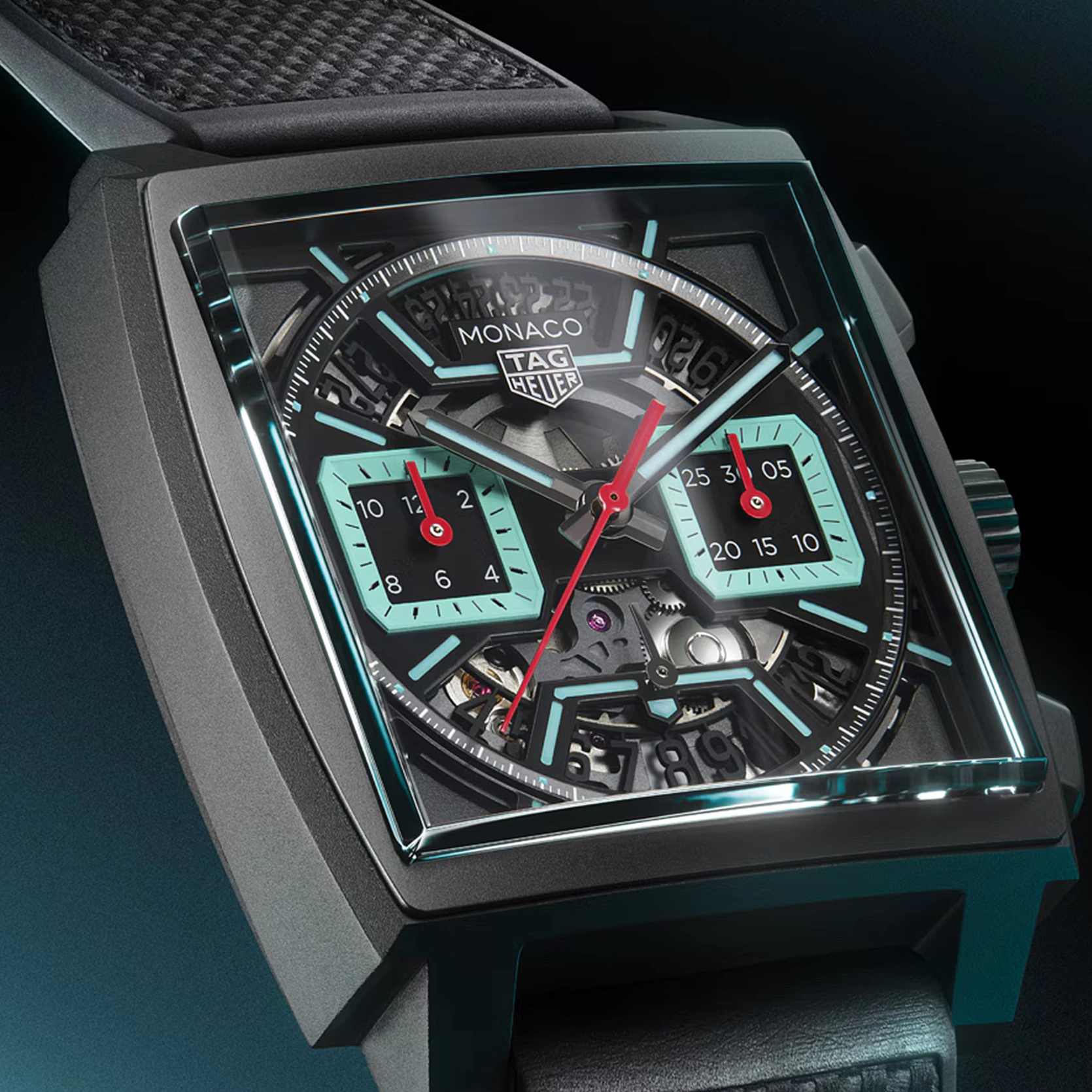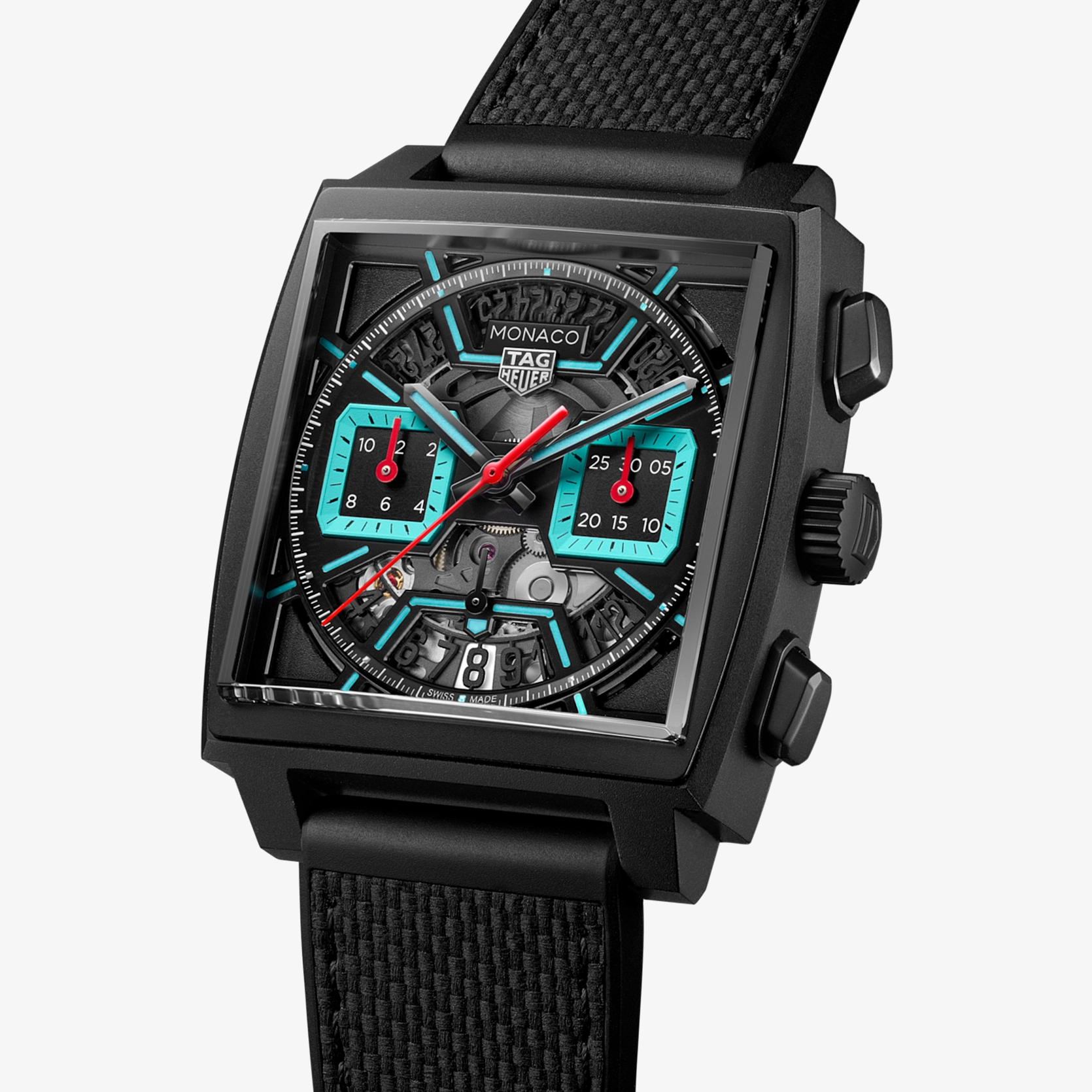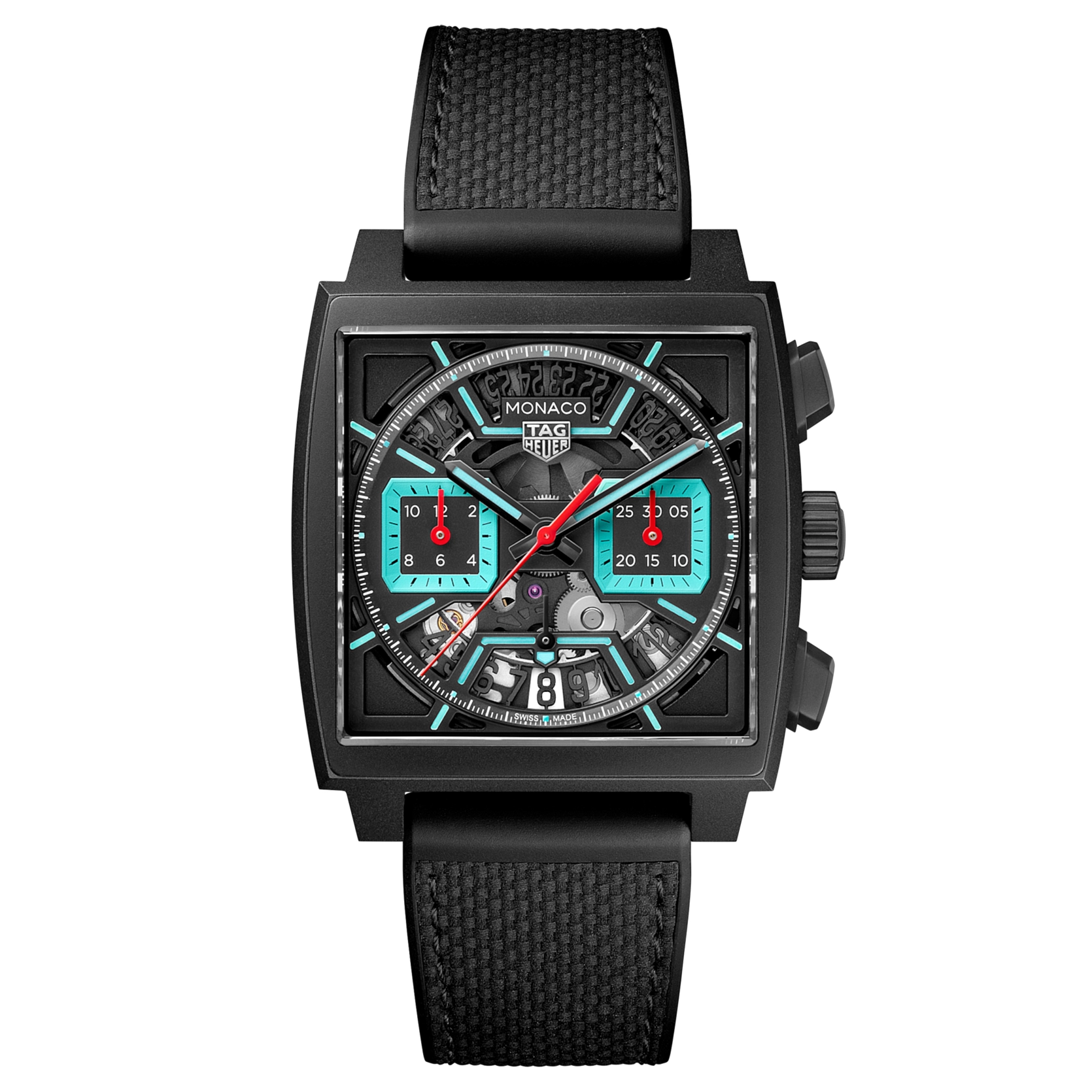 Ref. CBL2184.FT6236 - Kühne, avantgardistische Designelemente und ein unkonventioneller Look zeichnen diese einzigartige TAG Heuer Monaco aus. Ihre leuchtenden türkisfarbenen Akzente heben sich von dem schwarzen Zifferblatt ab, während das technische Calibre TH20-00 für extreme Präzision sorgt. Wild und unbändig.