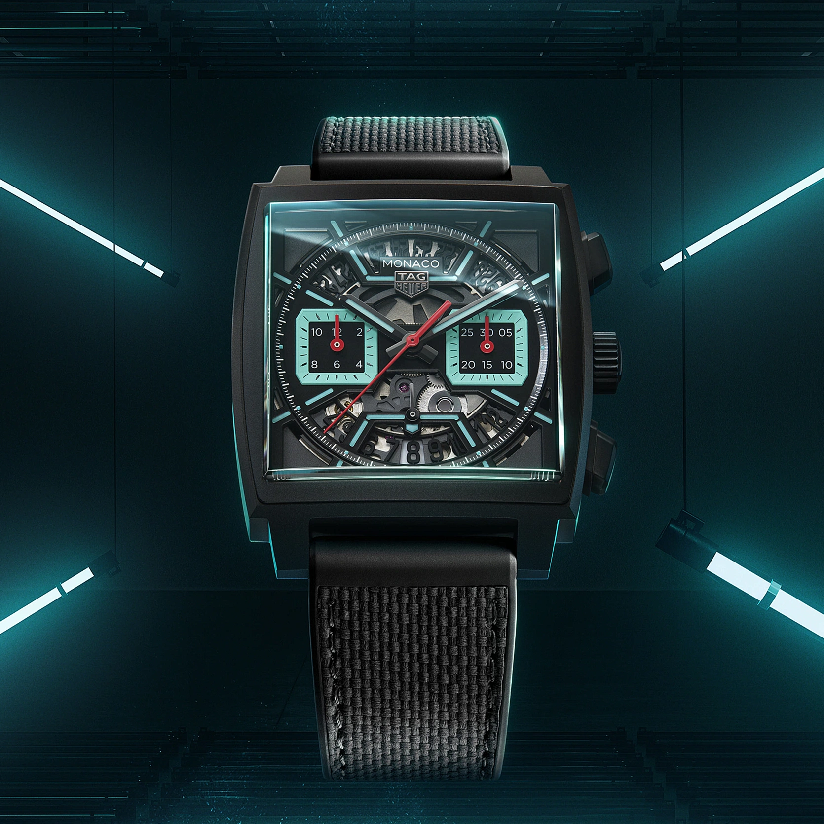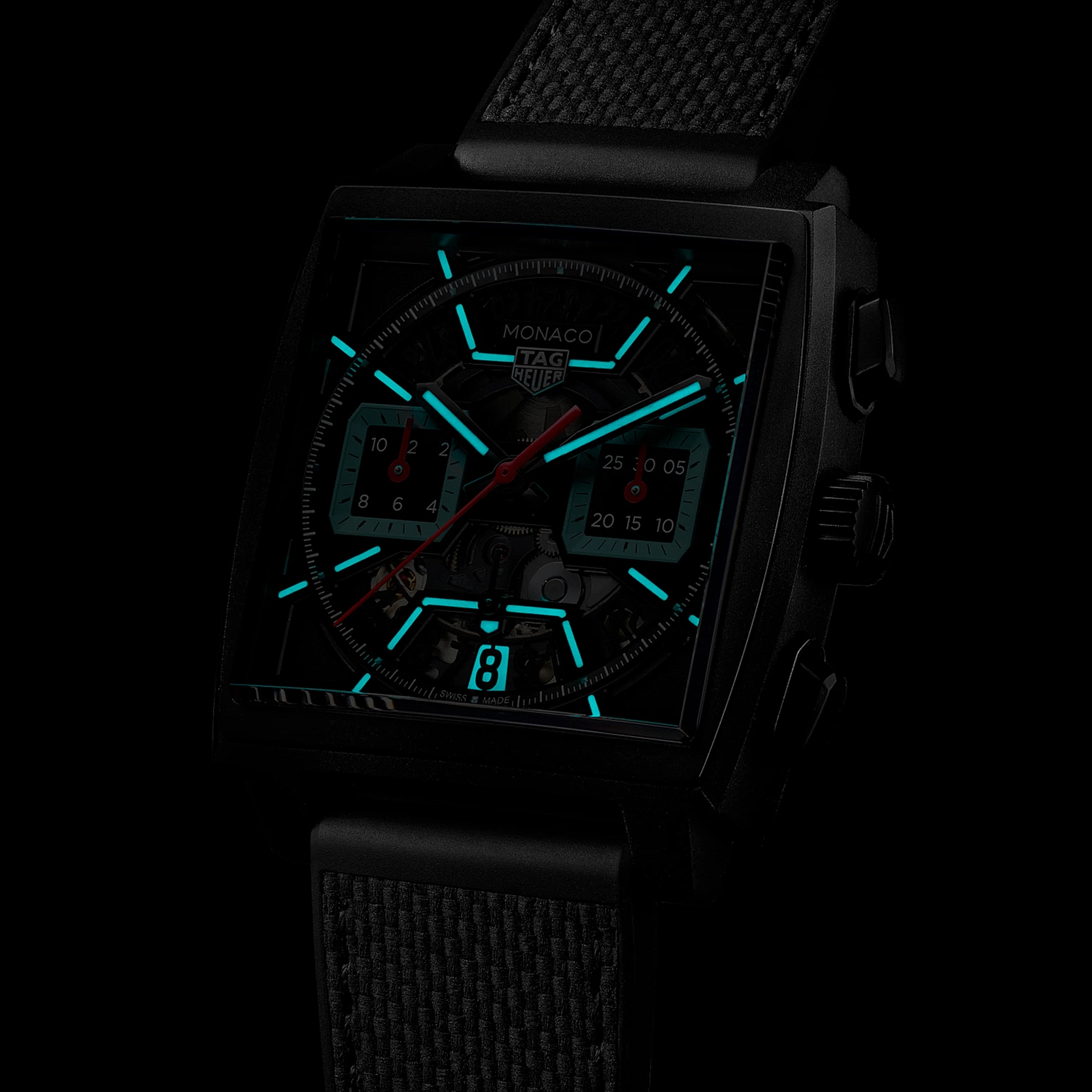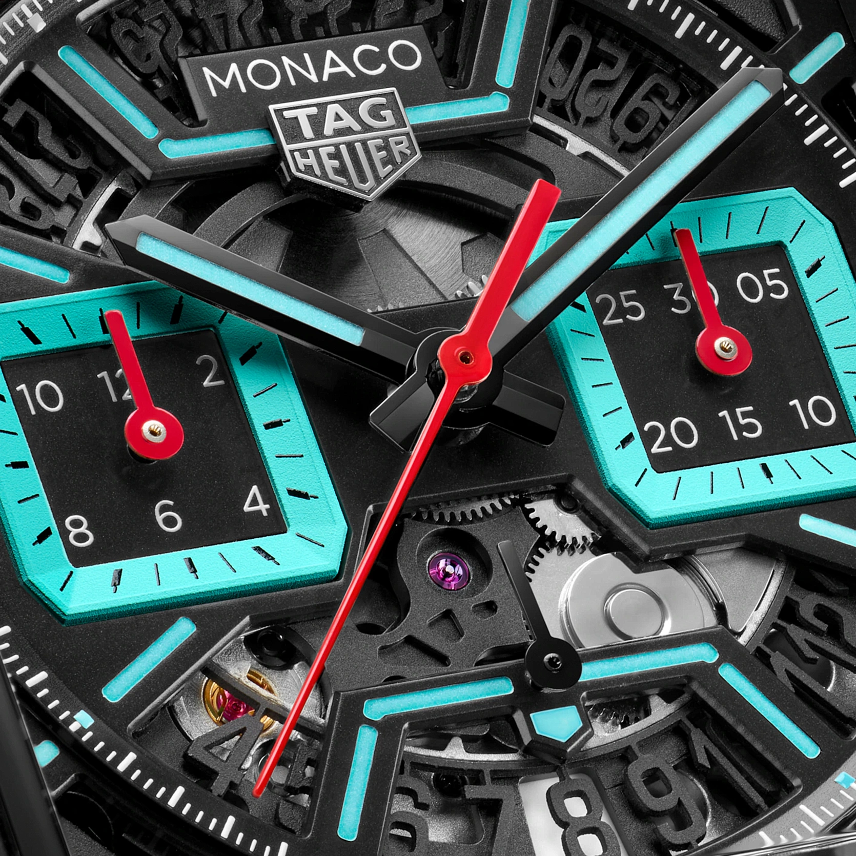 Ref. CBL2184.FT6236 - Kühne, avantgardistische Designelemente und ein unkonventioneller Look zeichnen diese einzigartige TAG Heuer Monaco aus. Ihre leuchtenden türkisfarbenen Akzente heben sich von dem schwarzen Zifferblatt ab, während das technische Calibre TH20-00 für extreme Präzision sorgt. Wild und unbändig.