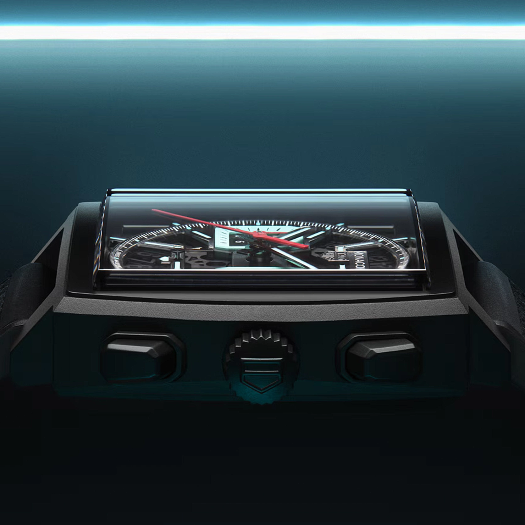 Das sandgestrahlte skelettierte Zifferblatt in Schwarz wird von leuchtenden türkisfarbenen Akzenten und lebhaften in Rot lackierten Zeigern ergänzt. Die Verkörperung von Coolness. Das rechteckige schwarze Gehäuse aus Titan Grad 2 mit DLC-Beschichtung offenbart sein maßgefertigtes Säulenrad und die Schwungmasse. In einer Kombination aus Kalbsleder und Kautschuk ist das geprägte schwarze Armband für jedes Vorhaben gewappnet.
