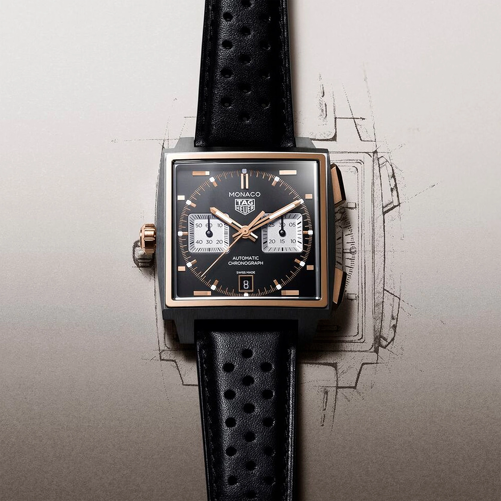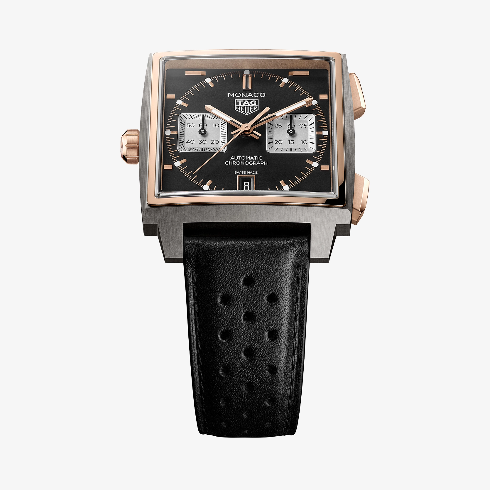 Ref. CDW2150.FC8360 Dieser edle TAG Heuer Monaco Chronograph kombiniert ein modernes Design mit einem Hauch von Luxus. Sein 39-mm-Gehäuse aus Titan Grad 5 und massivem 18 K 5N Roségold interpretiert die ikonische Form der TAG Heuer Monaco in einer leichten, robusten und kontrastreichen Version neu – für den Antrieb sorgt das hauseigene Automatikwerk Calibre TH20-11. Das opalisierende schwarze Zifferblatt weist silberfarbene Hilfszifferblätter sowie Zeiger und Indizes mit 18 K 5N Roségoldbeschichtung auf, die für einwandfreie Ablesbarkeit mit weißer Super-LumiNova® versehen sind. Das anglierte Datum bei 6 Uhr fügt dem Zifferblatt ein ausgleichendes Element hinzu, während die subtilen goldenen Akzente die charakteristische Geometrie der TAG Heuer Monaco hervorheben.