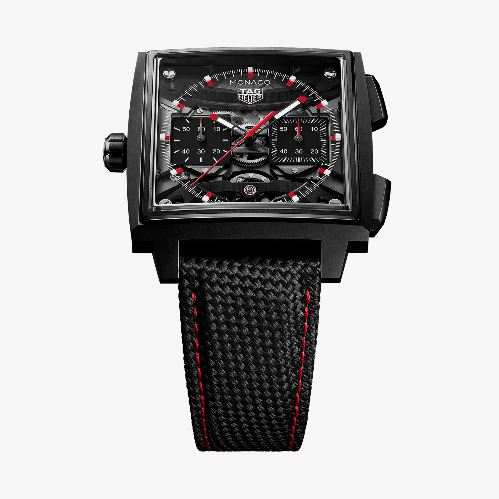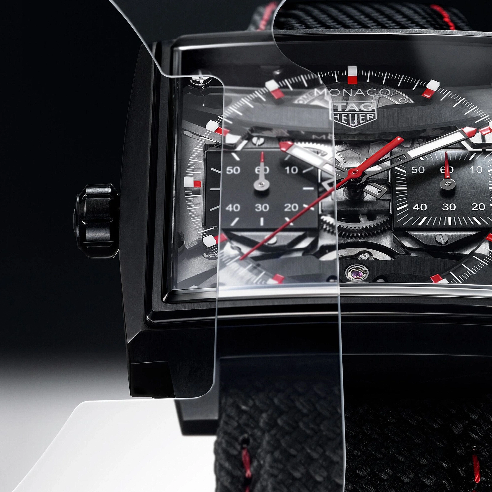 Ref. CEW5180.FT8122 - Die TAG Heuer Monaco Evergraph sorgt beim kühnsten Chronographen der Maison für unverkennbare technische Intensität. Ihr Herzstück, das Kaliber TH80-00, revolutioniert die Zeitmessung durch seine ausgeklügelte Technologie, die mittels flexibler Komponenten für seine Chronographenfunktion eine überlegene Zuverlässigkeit und Präzision erzielt. Das durchscheinende Zifferblatt eröffnet den Blick auf ein skulpturales Wechselspiel der Texturen: schwarze, opalisierende Zähler, Brücken mit schwarzer DLC-Beschichtung und leuchtend rote Akzente auf den Chronographenzeigern. Von der umgekehrten Uhrwerkskonstruktion bis zu den leuchtenden, durchbrochenen Zeigern erhöht jedes Detail den Kontrast und die Übersichtlichkeit bei allen Lichtbedingungen.
