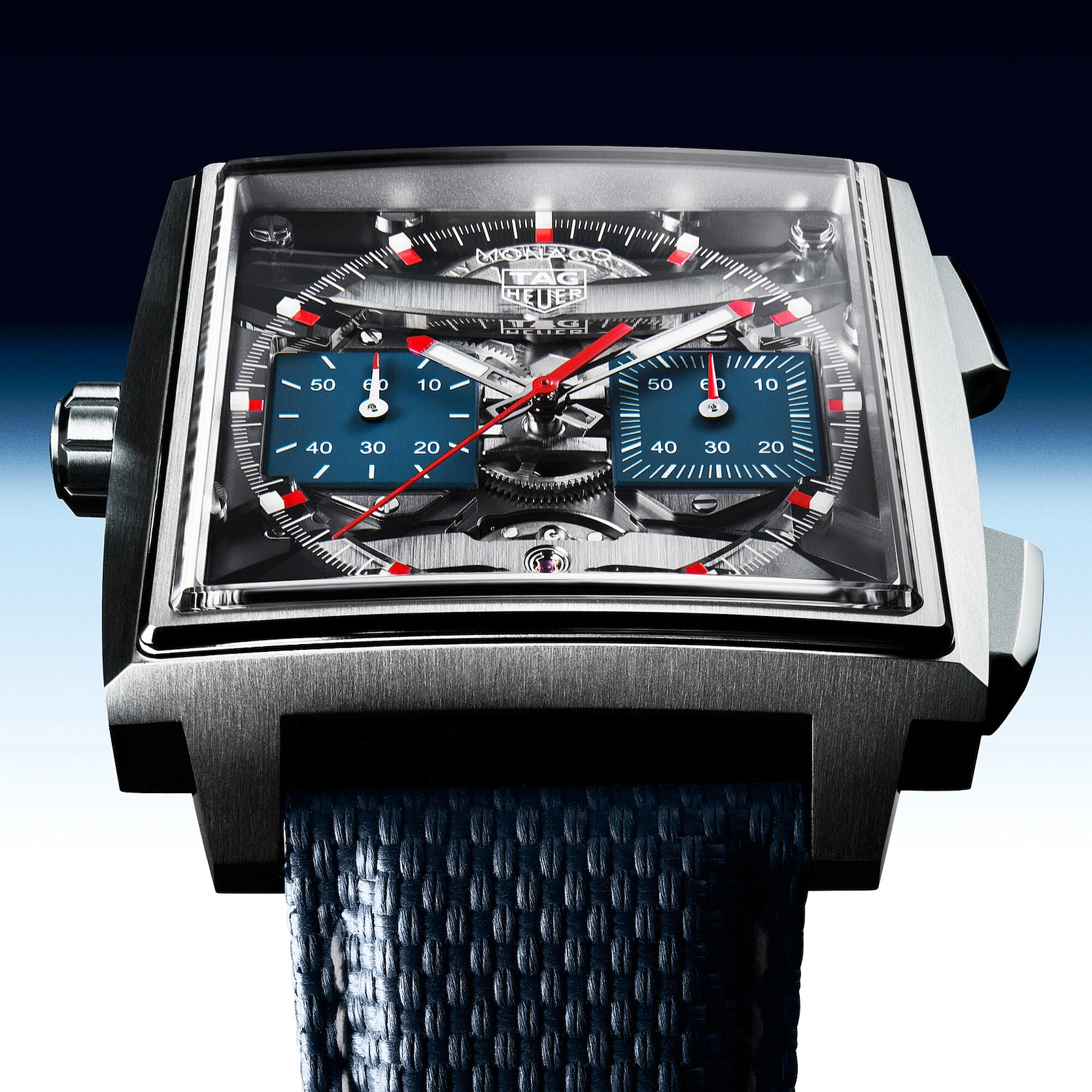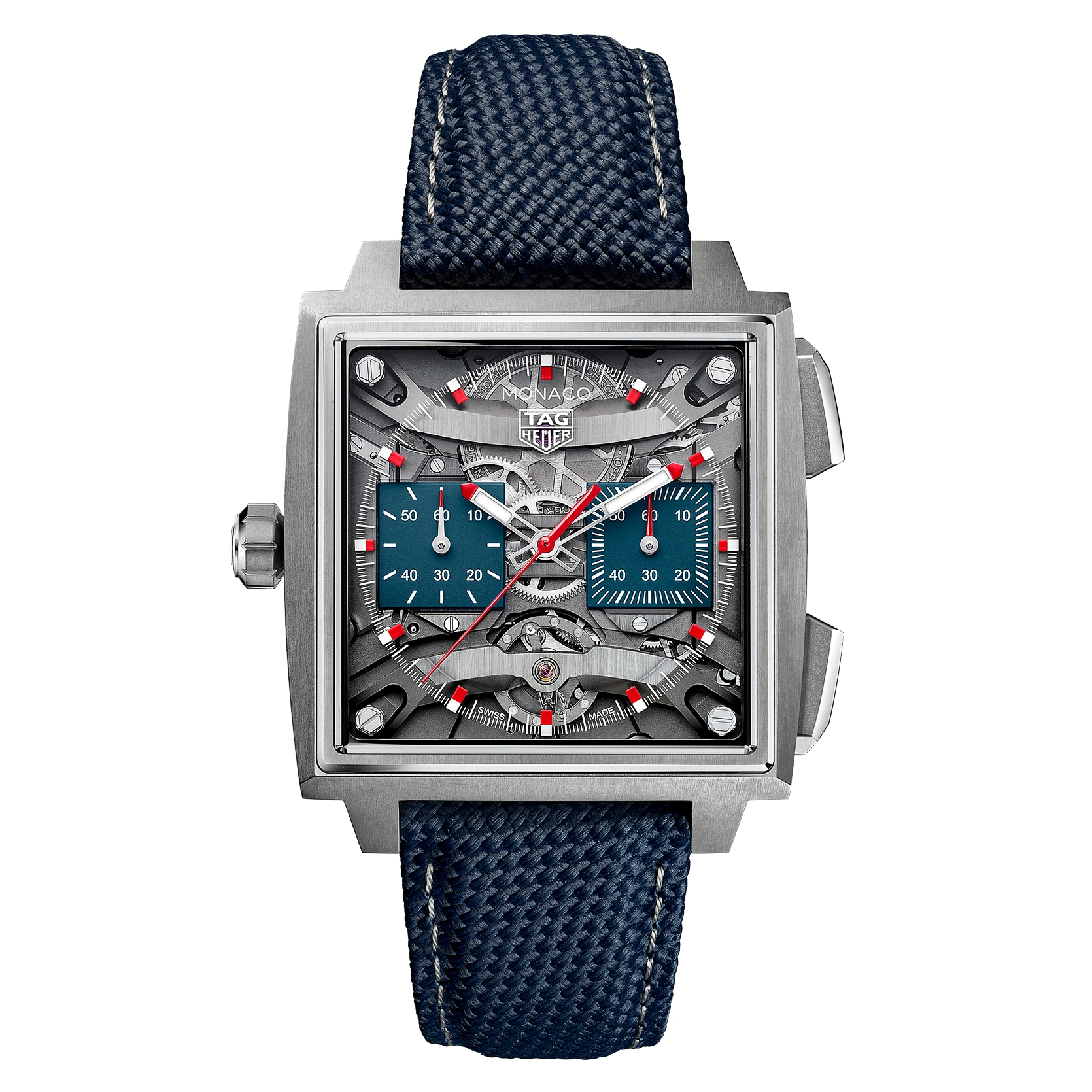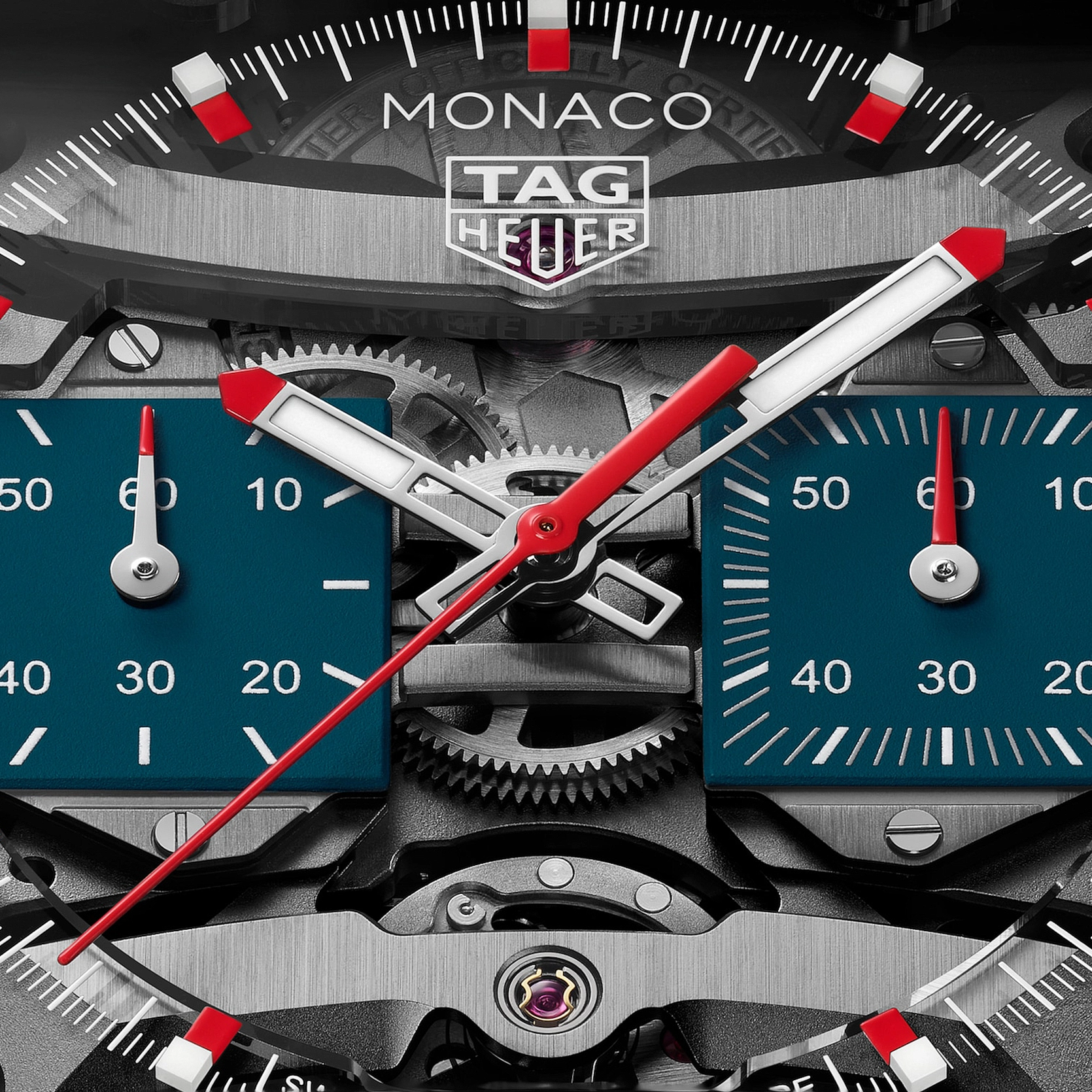 Ref. CEW5181.FT8123 - Die TAG Heuer Monaco Evergraph ist eine echte Chronographenrevolution und bildet einen entscheidenden Meilenstein im unermüdlichen Innovationsstreben der Maison. Der vom Automatikwerk Kaliber TH80-00 angetriebene Zeitmesser ist mit einem bahnbrechenden, ausgeklügelten Chronographenmechanismus ausgestattet, der mit flexiblen Komponenten gebaut ist, die die Reibung minimieren, den Verschleiß reduzieren und für Langlebigkeit, Zuverlässigkeit und Präzision sorgen. Durch das durchscheinende Zifferblatt offenbart die durchbrochene Architektur fein gebürstete Brücken und blaue opalisierende Zähler mit roten und weißen Akzenten. Blockindizes mit Super-LumiNova® und rhodinierte Zeiger gewährleisten perfekte Klarheit, während der rot lackierten Chronographenzeiger für eine markante Rennsportnote sorgt.