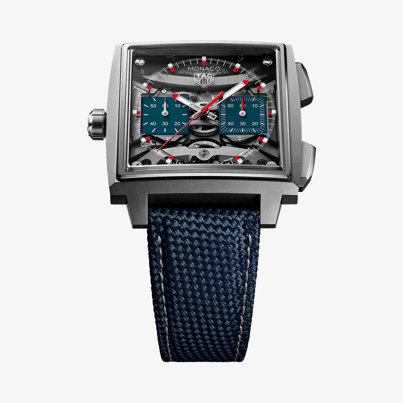 Das Kaliber TH80-00 verfolgt mit seinen flexiblen Komponenten einen neuartigen Ansatz für das Chronographenwerk und bietet herausragende Zuverlässigkeit. Darüber hinaus ist dieses COSC-zertifizierte Werk mit dem exklusiven TH-Carbonspring Oszillator von TAG Heuer ausgestattet, das überlegene Stabilität und Präzision gewährleistet. Das 40-mm-Gehäuse aus Titan Grad 5 vereint Robustheit mit Leichtgewichtigkeit. Der Gehäuseboden aus Saphirglas gibt den Blick frei auf die komplexe Architektur des quadratischen Kalibers, während das blaue Kautschukarmband mit Textilprägung und grauer Absteppung Komfort und Eleganz vereint. Diese TAG Heuer Monaco verkörpert den avantgardistischen Esprit der Maison –innovativ, unverkennbar und auf Langlebigkeit ausgelegt.