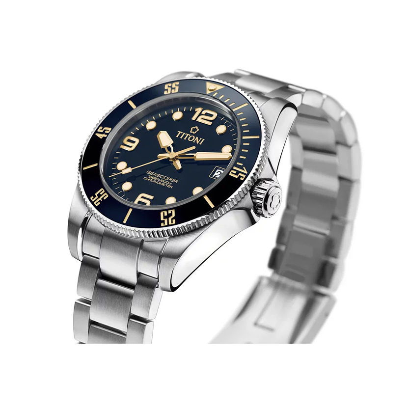 Ref. 83600 S-BO-255 - Die erste Seascoper erschien 1963, damals noch unter Felca, der Muttermarke von TITONI. Es handelte sich dabei um eine der ersten populären Armbanduhren für Taucher. Die legendäre Seascoper der 1960er Jahre bestach vor allem durch ihr praktisches Design und die hervorragende Lesbarkeit des Zifferblattes. Die neueste Version, die Seascoper 600, ein COSC-zertifizierter Chronometer, stellt einen historischen Wendepunkt dar: Ausgerüstet mit dem eigenen Manufakturwerk T10 garantiert sie eine Wasserdichte von 600 Metern Tiefe. Damit setzt sie völlig neue Massstäbe und ist explizit auch auf die Bedürfnisse professioneller Taucher ausgerichtet.
